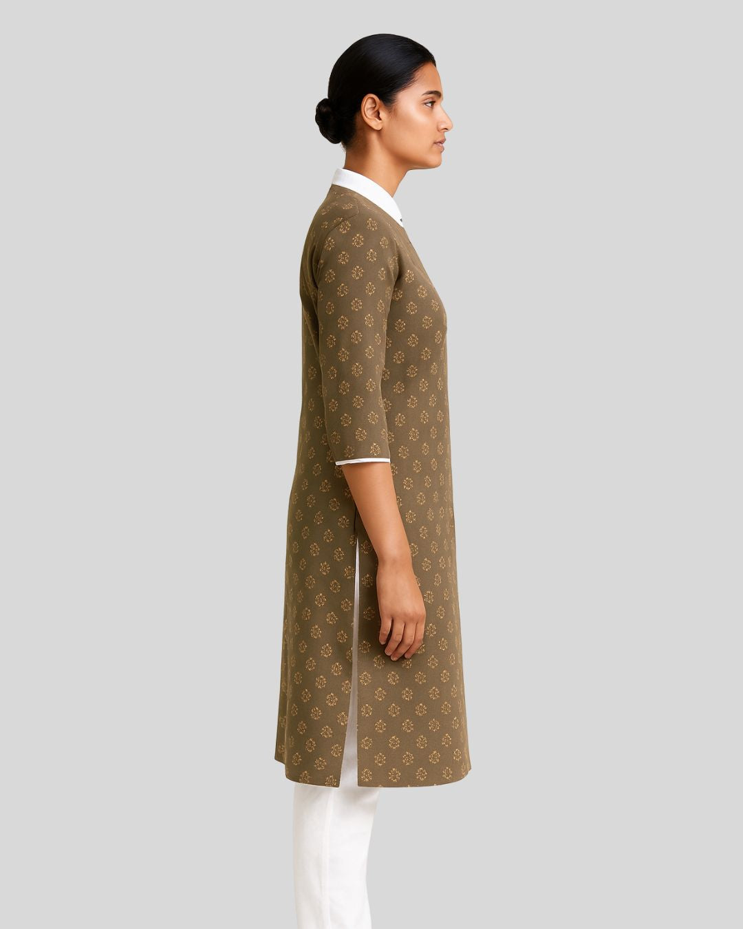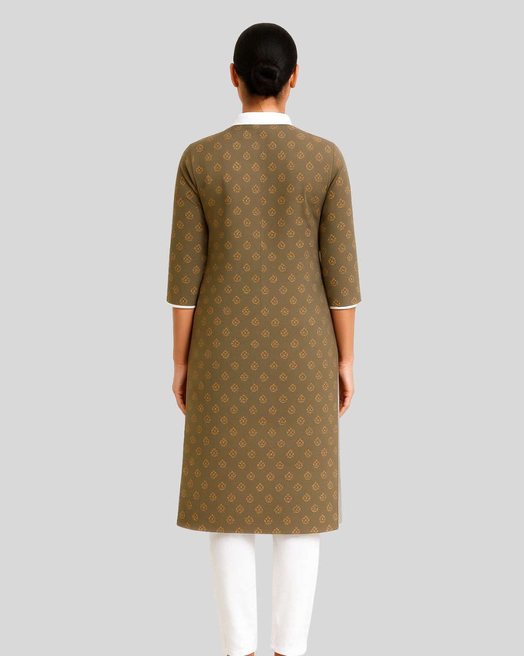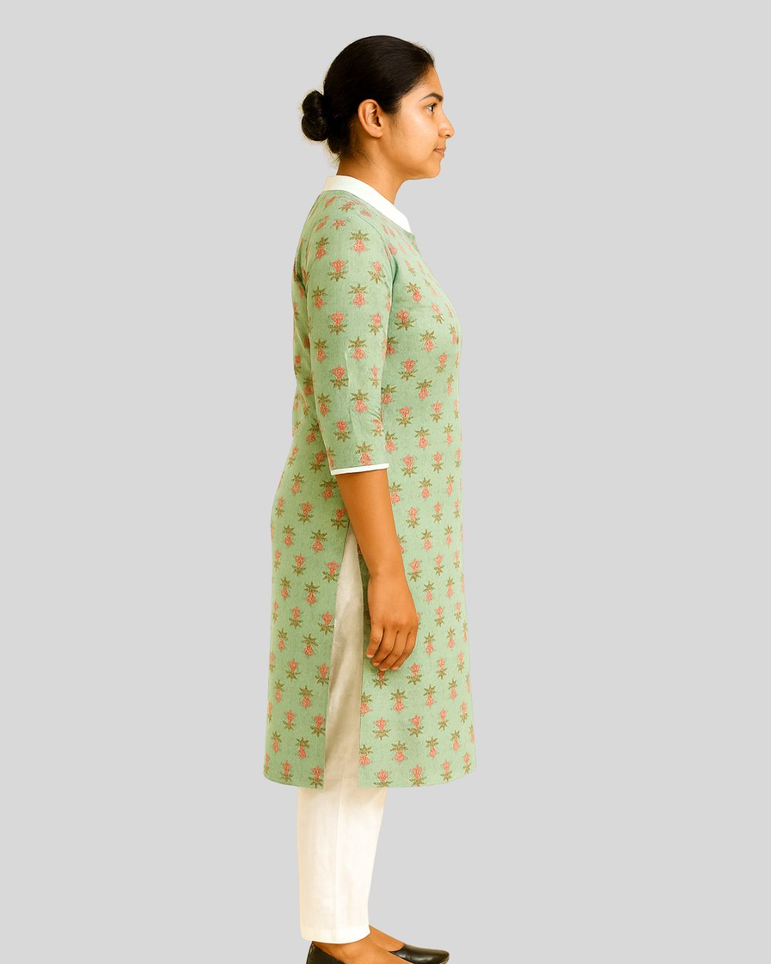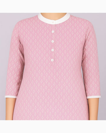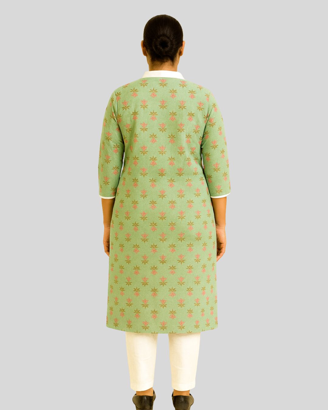 Printed kurta with a mandarin collar, button placket, and three-quarter sleeves, straight fit, paired with white bottoms. Wrinkle-free and easy-care.