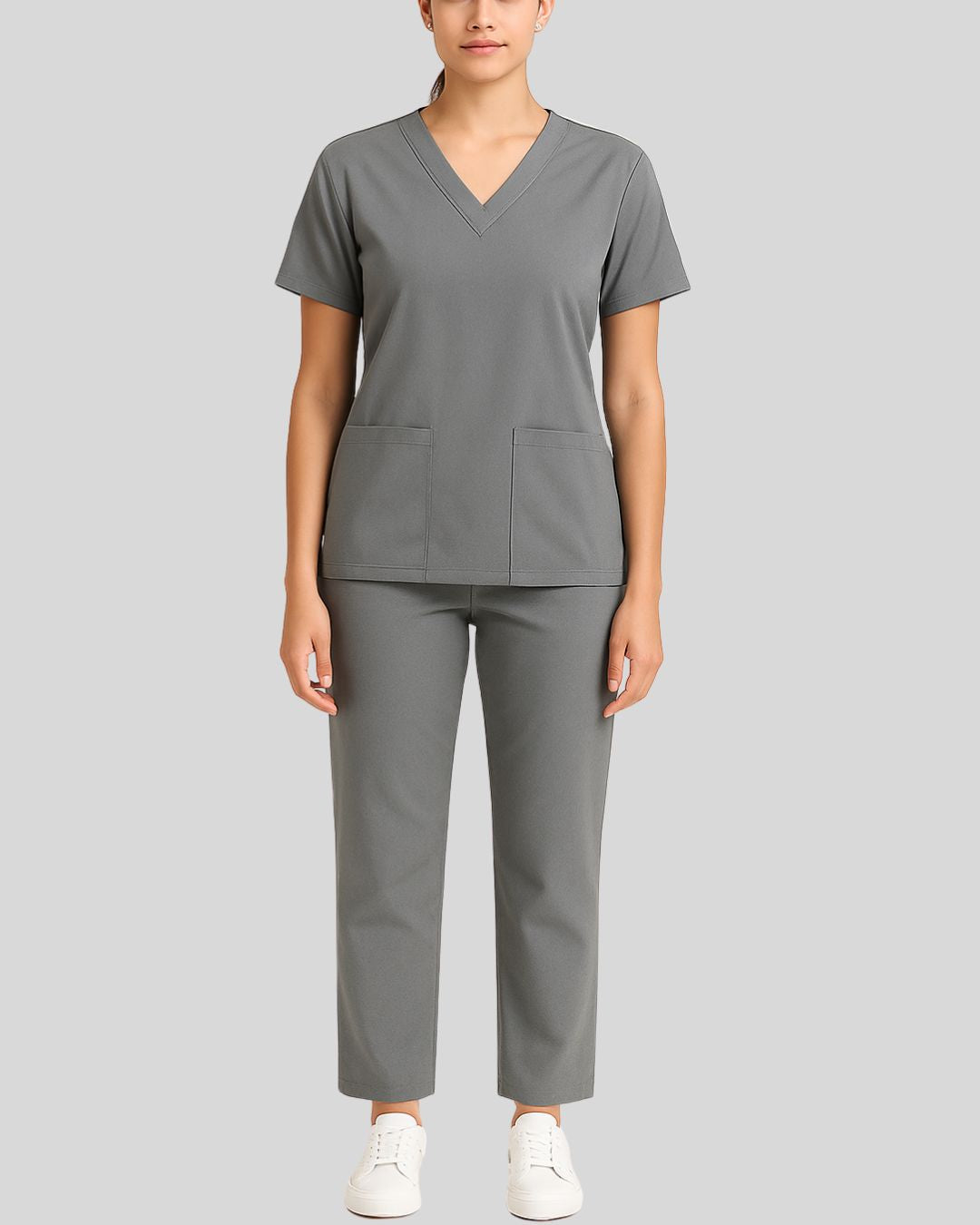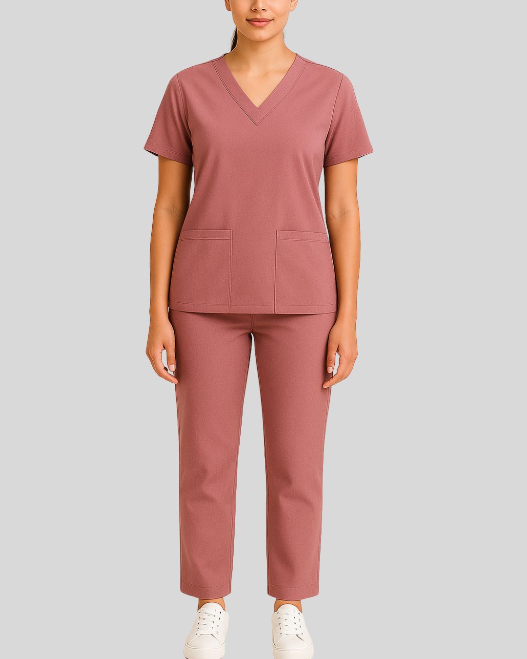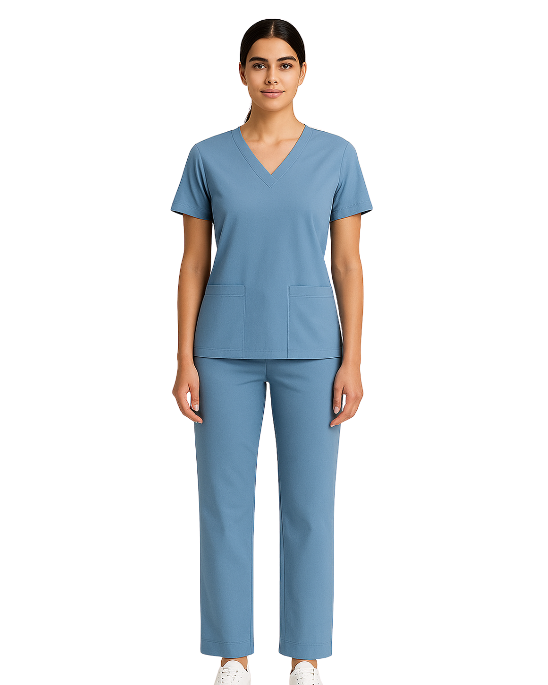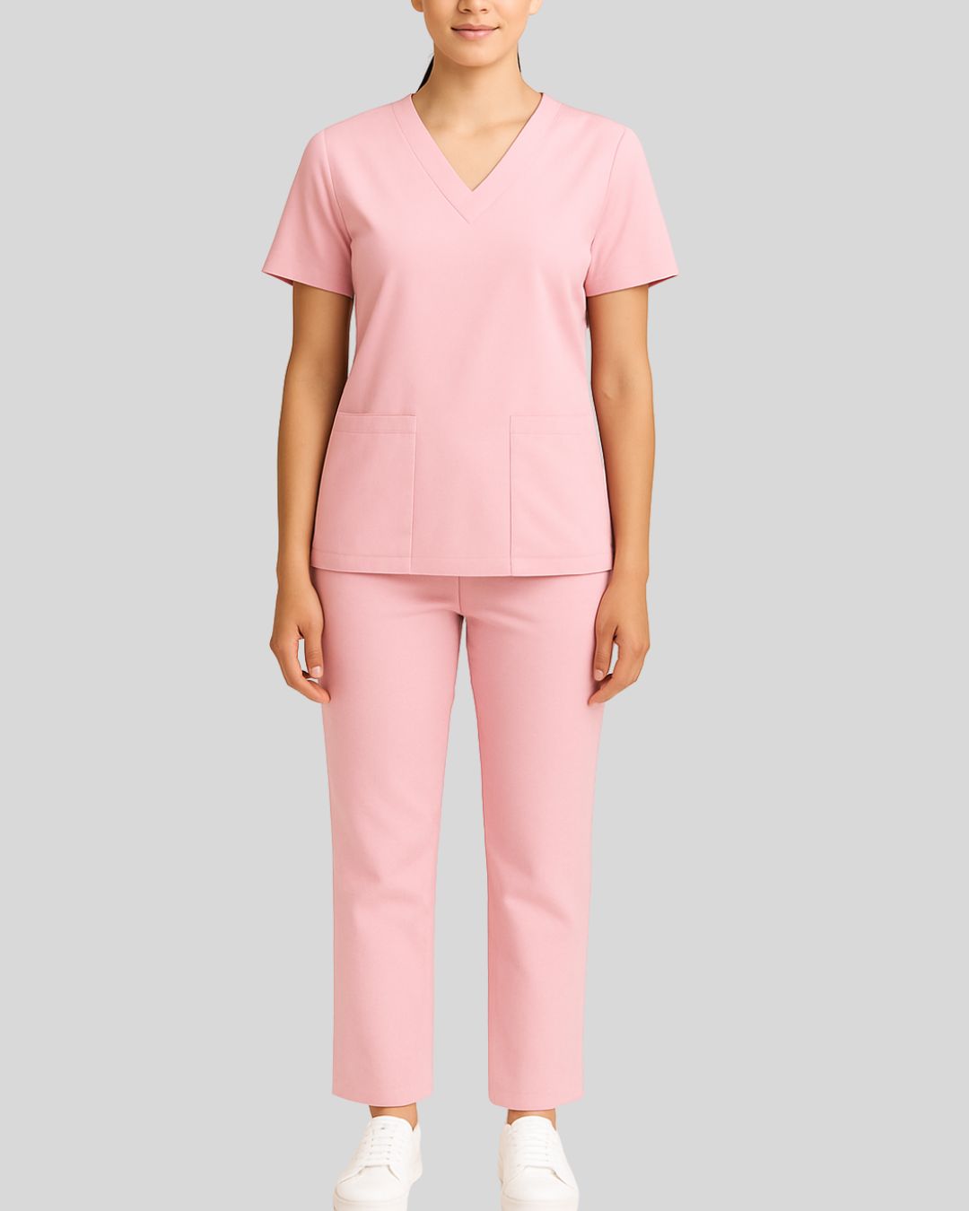 V-neck scrub top with short sleeves and two front patch pockets, paired with straight-leg bottoms. Design is wrinkle-free and easy-care.