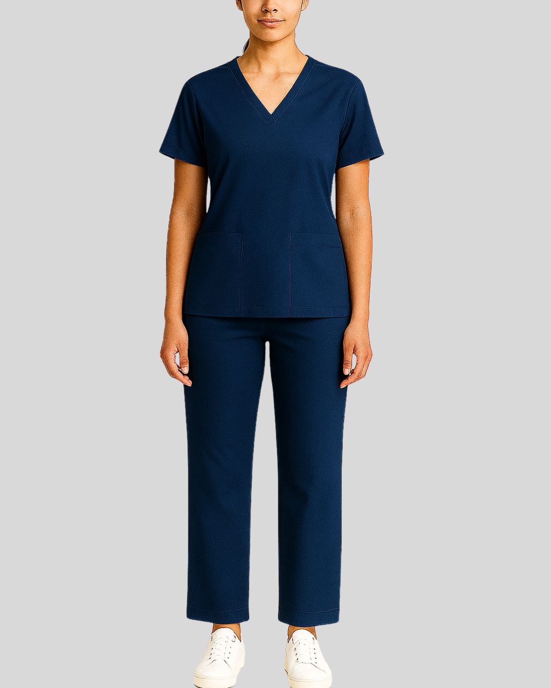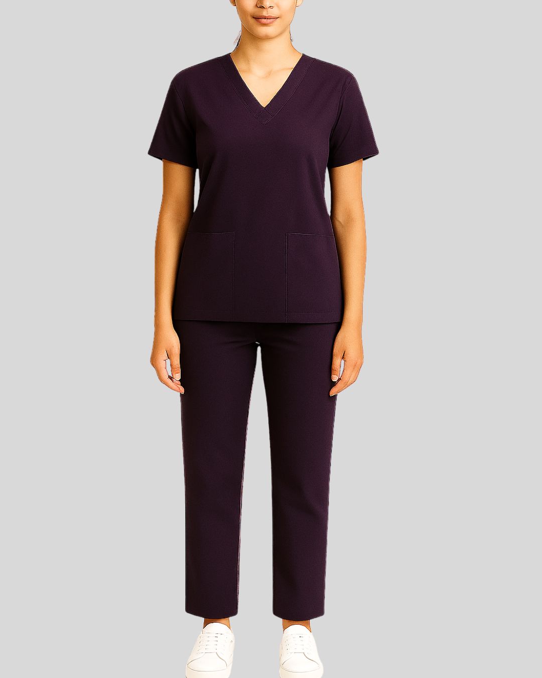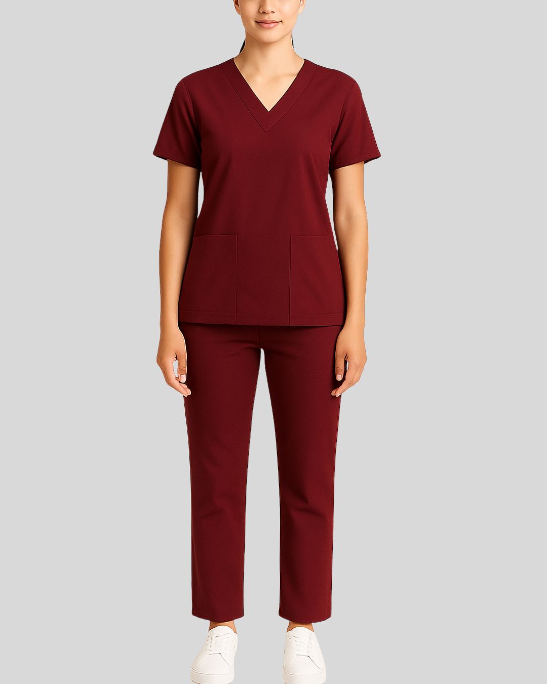 V-neck scrub top with short sleeves and two front patch pockets, paired with straight-leg bottoms. Design is wrinkle-free and easy-care.