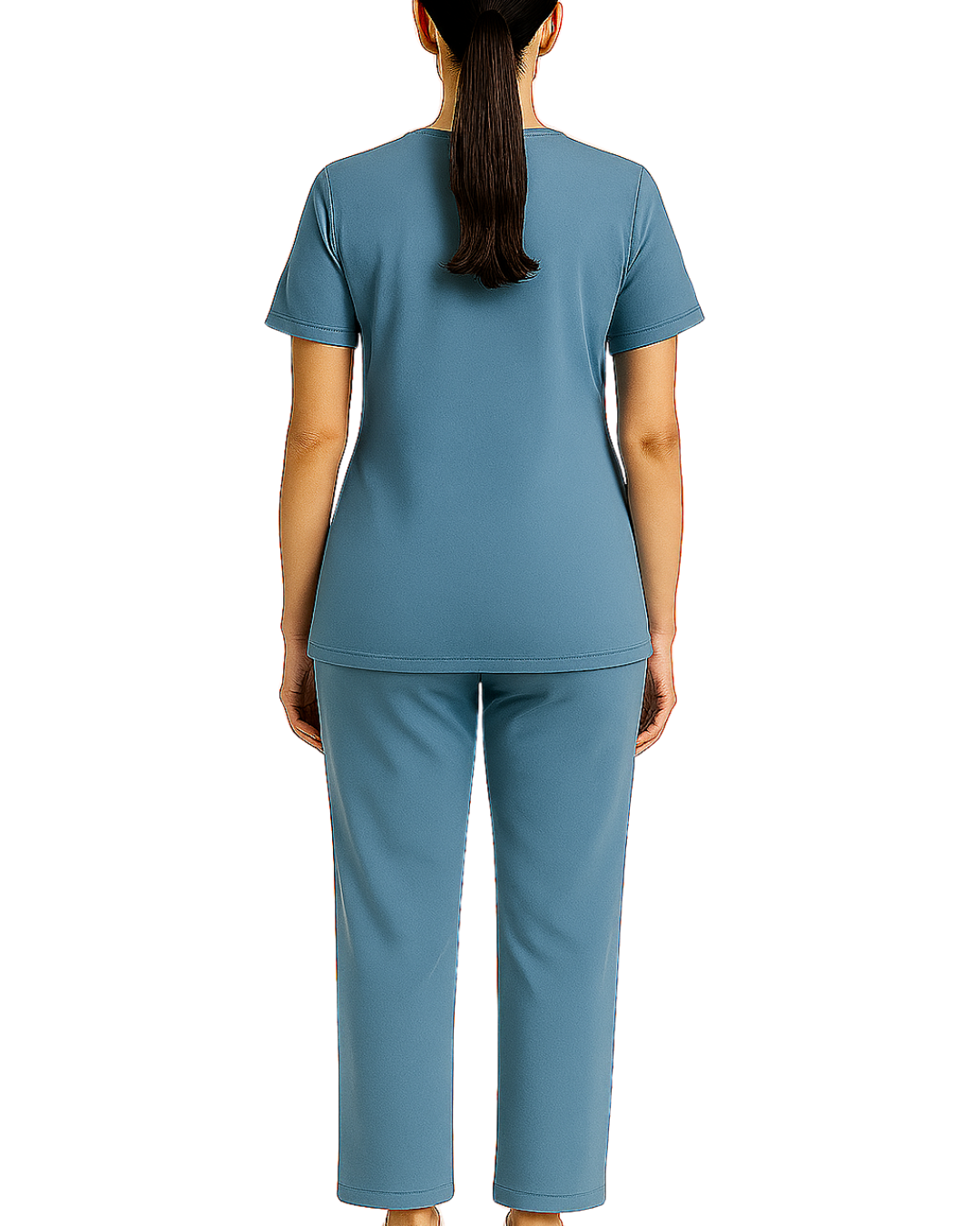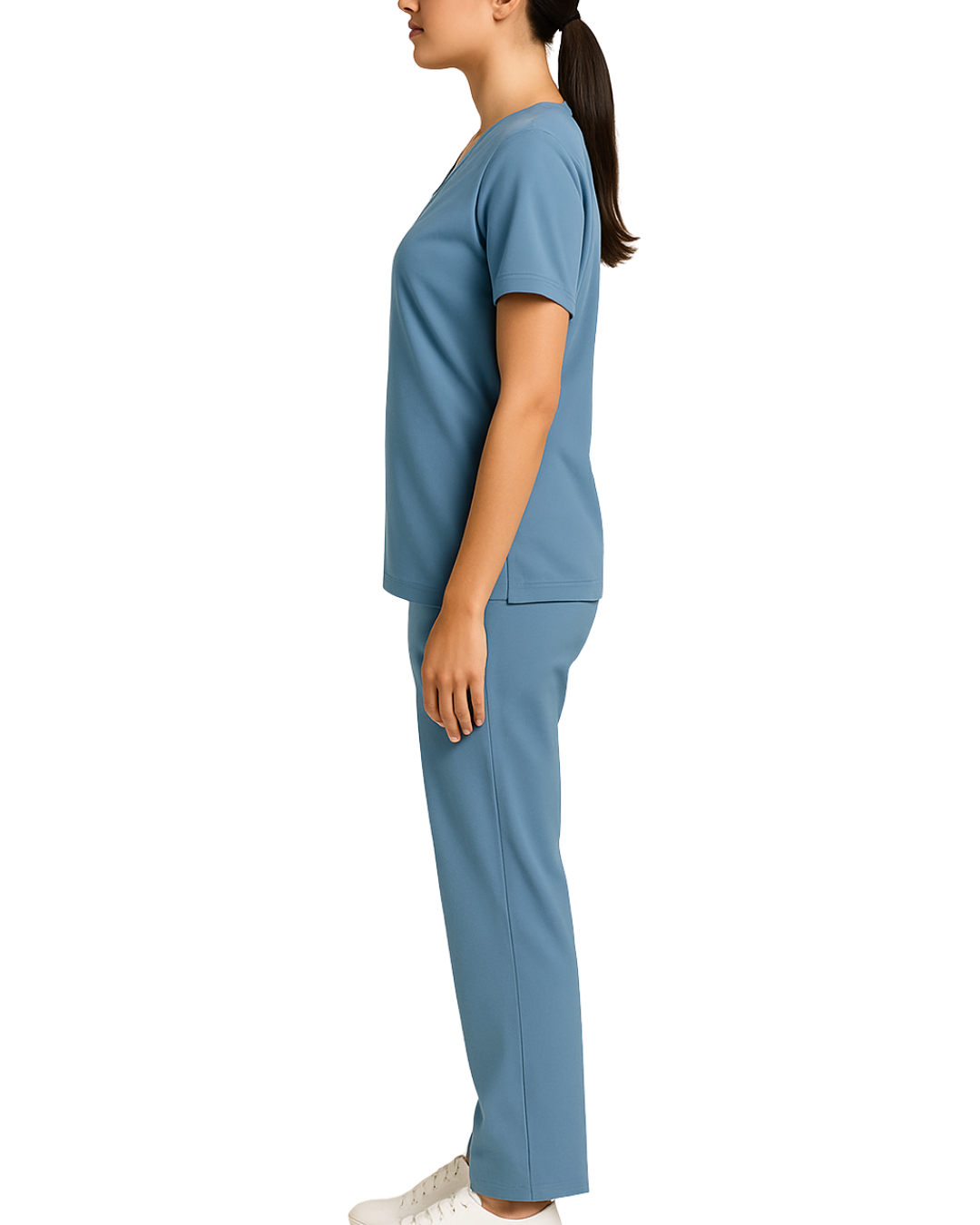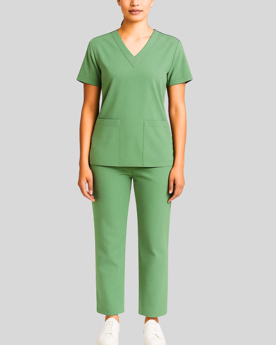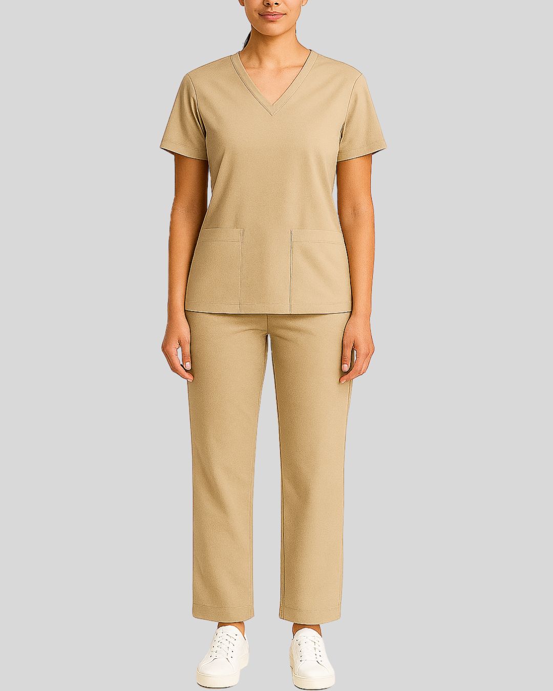 V-neck scrub top with short sleeves and two front patch pockets, paired with straight-leg bottoms. Design is wrinkle-free and easy-care.