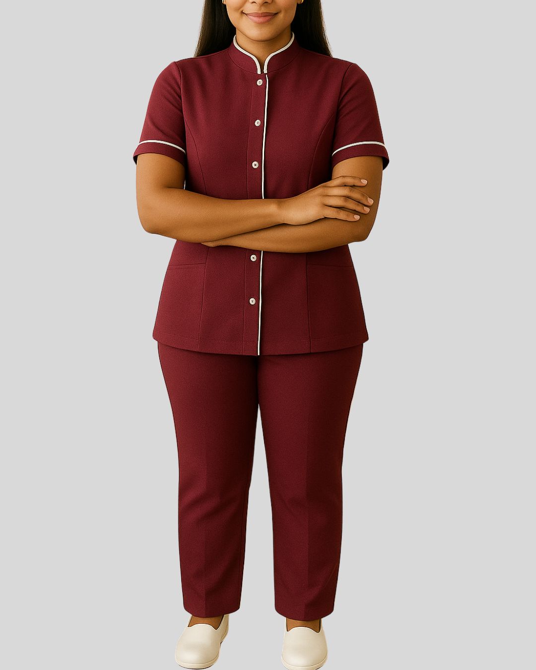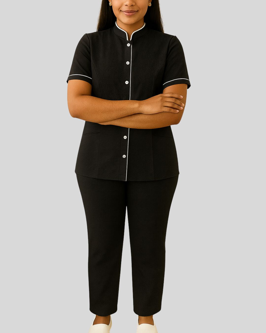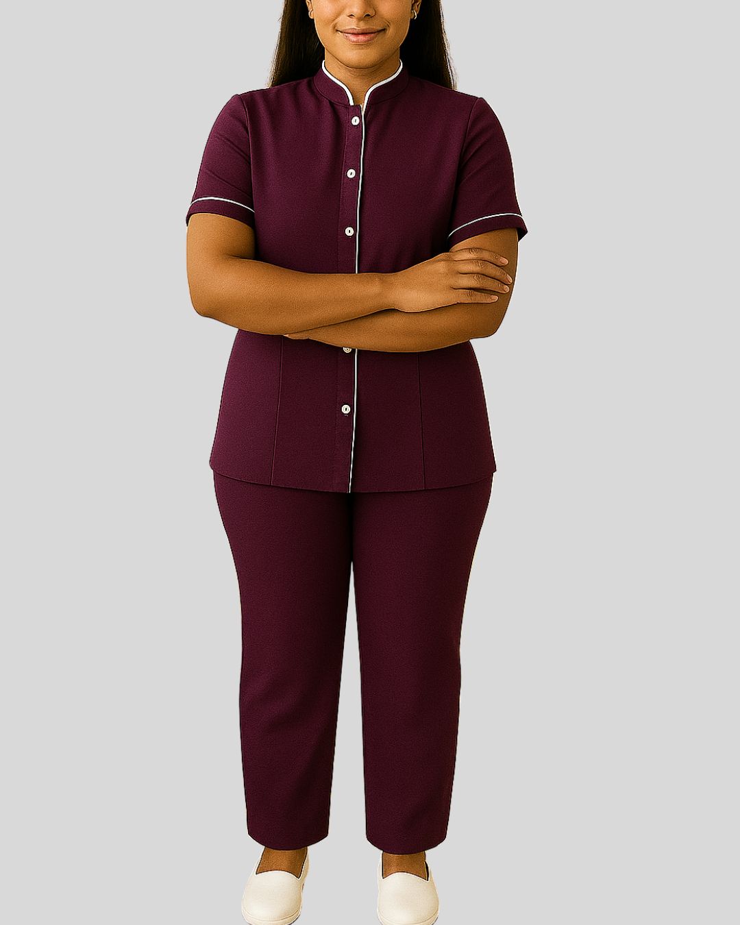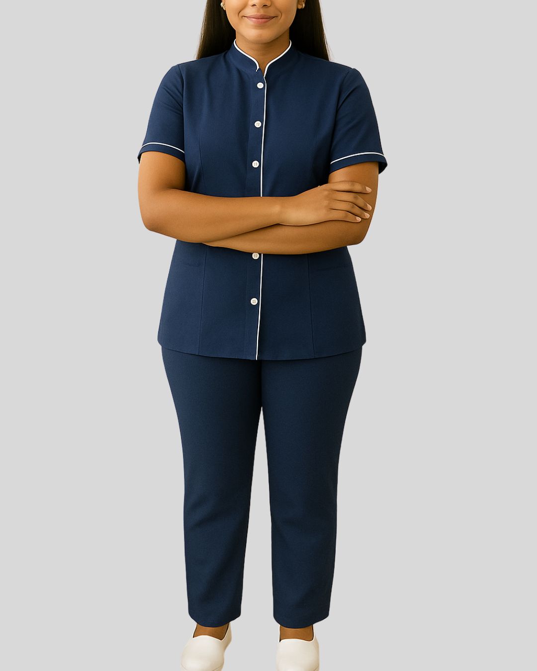Relaxed-fit tunic with a mandarin collar, partial button placket, and three-quarter sleeves with white piping on the collar and cuffs, paired with straight-fit bottoms. Design is wrinkle-free