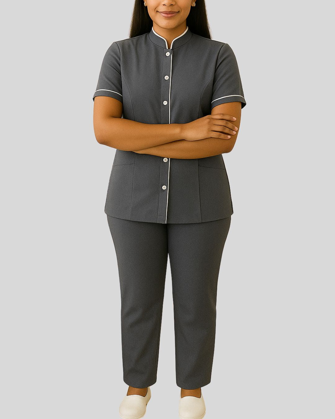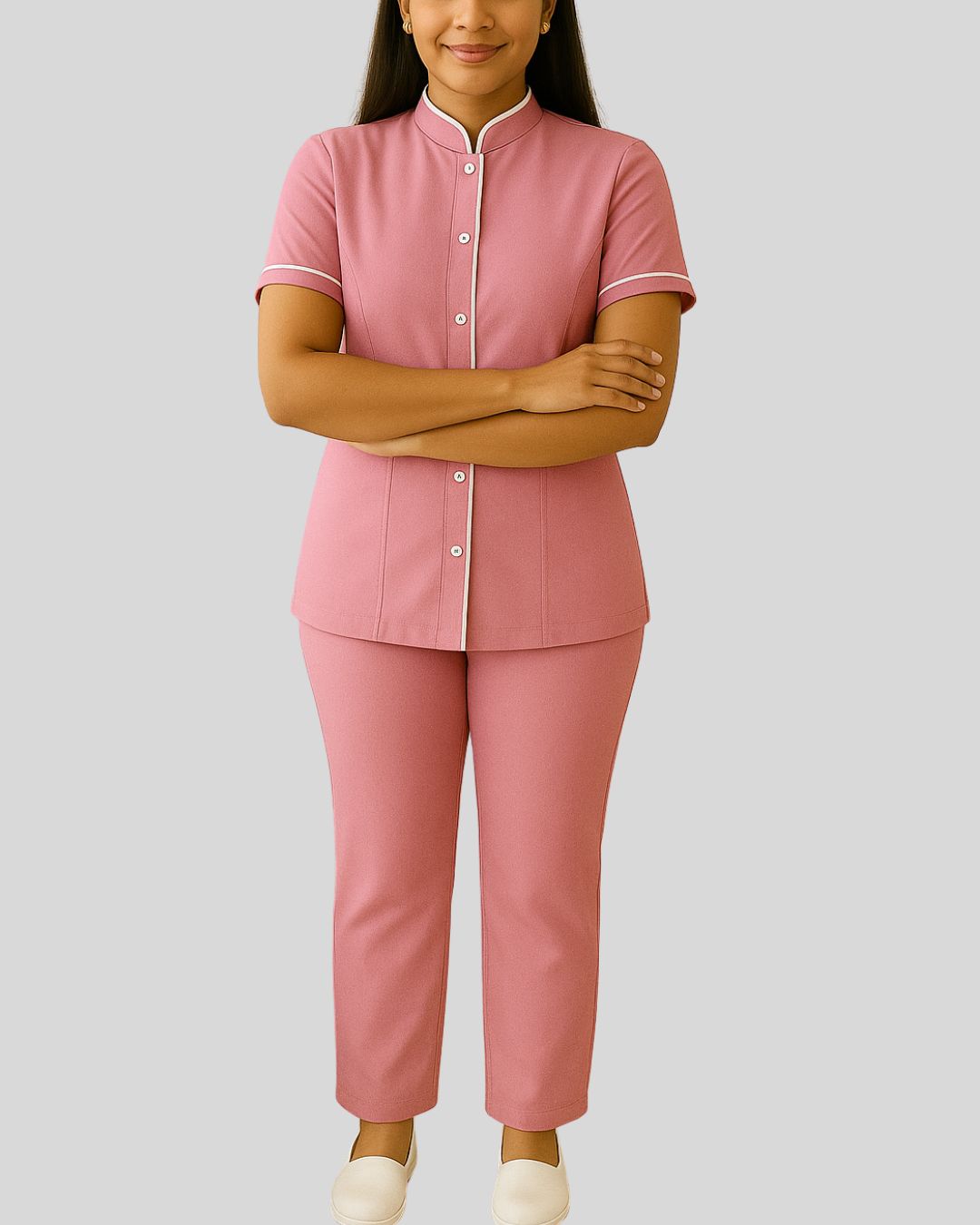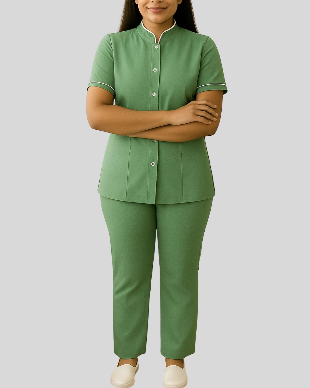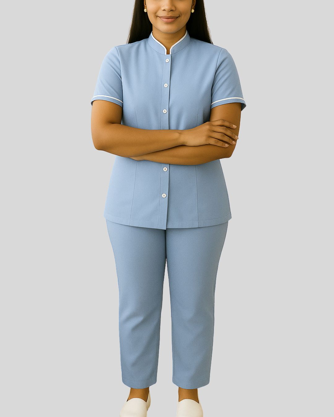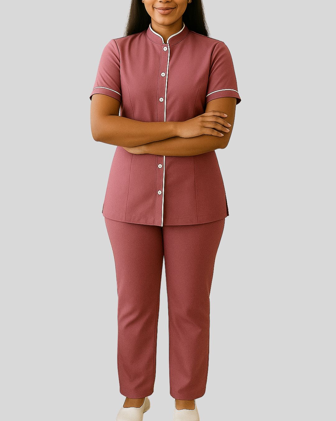 Relaxed-fit tunic with a mandarin collar, partial button placket, and three-quarter sleeves with white piping on the collar and cuffs, paired with straight-fit bottoms. Design is wrinkle-free