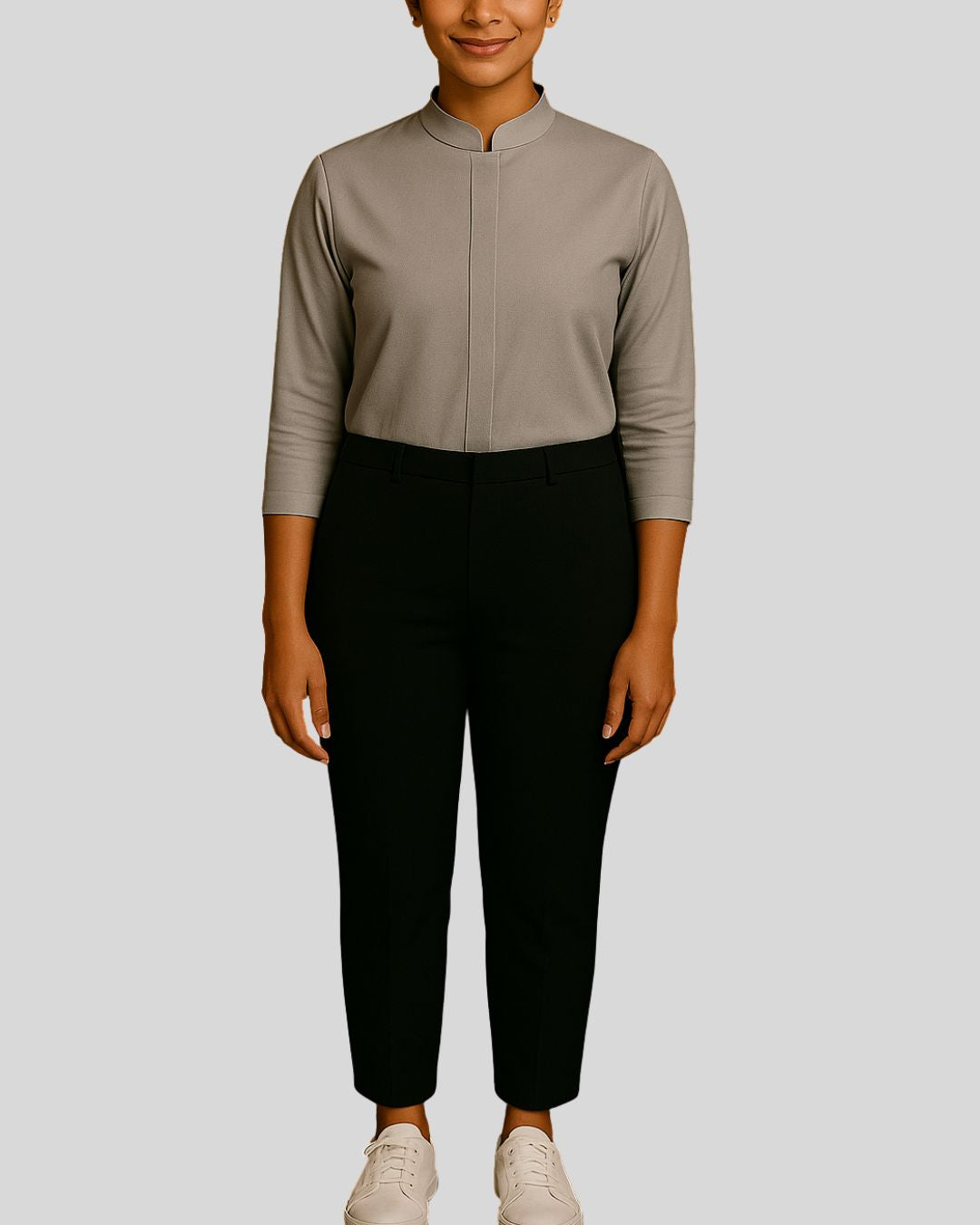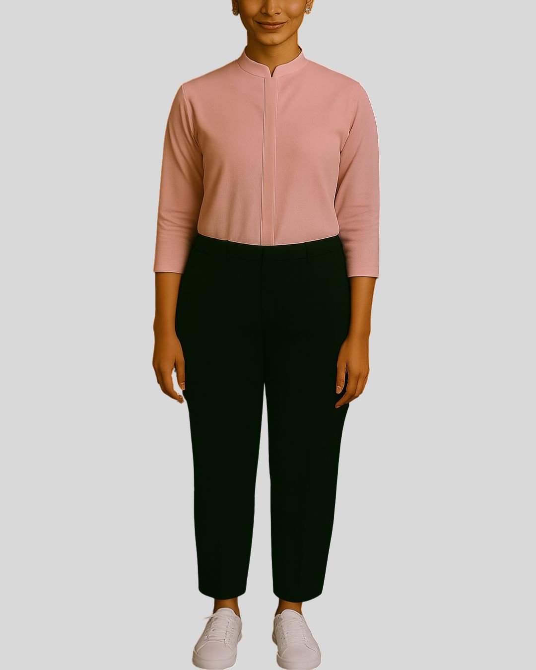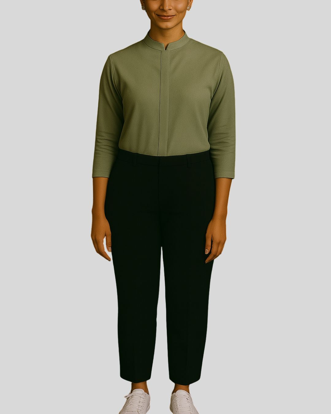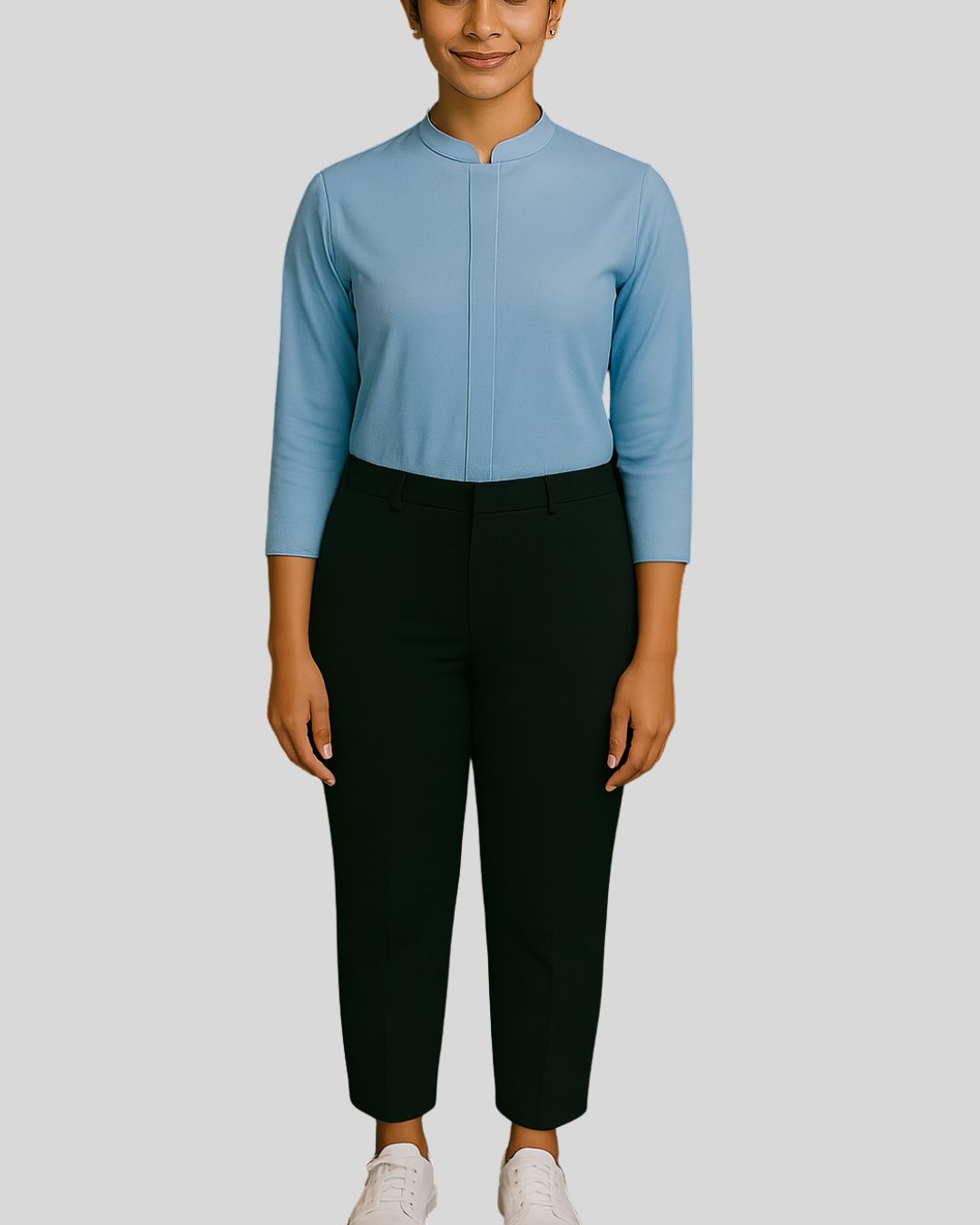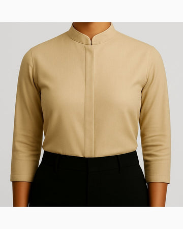 Straight-fit top with a mandarin collar, one-third length sleeves, and a concealed button placket, paired with straight bottoms. Design is wrinkle-free for a neat and polished look.