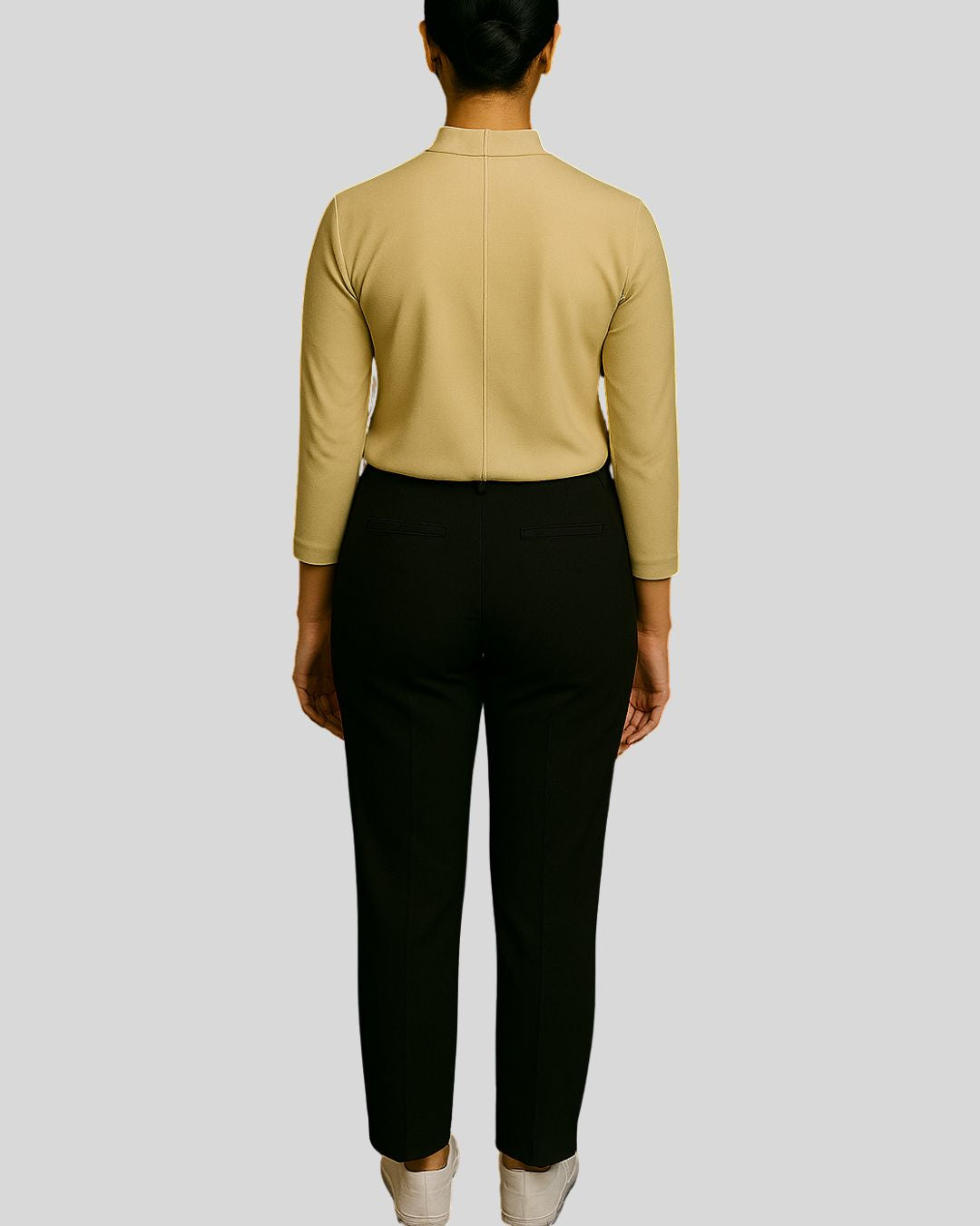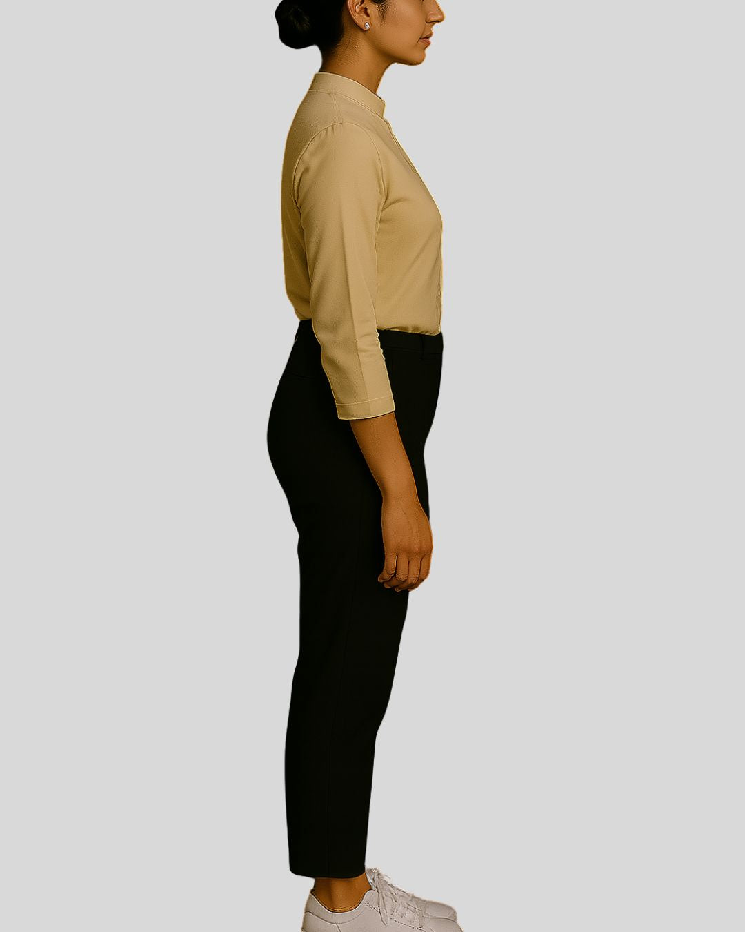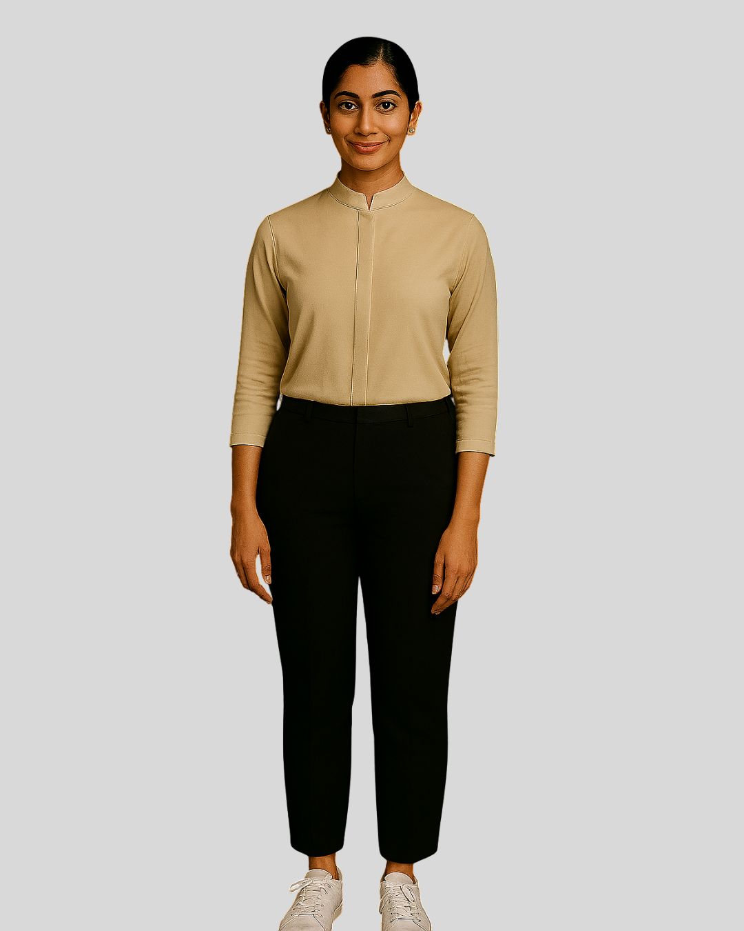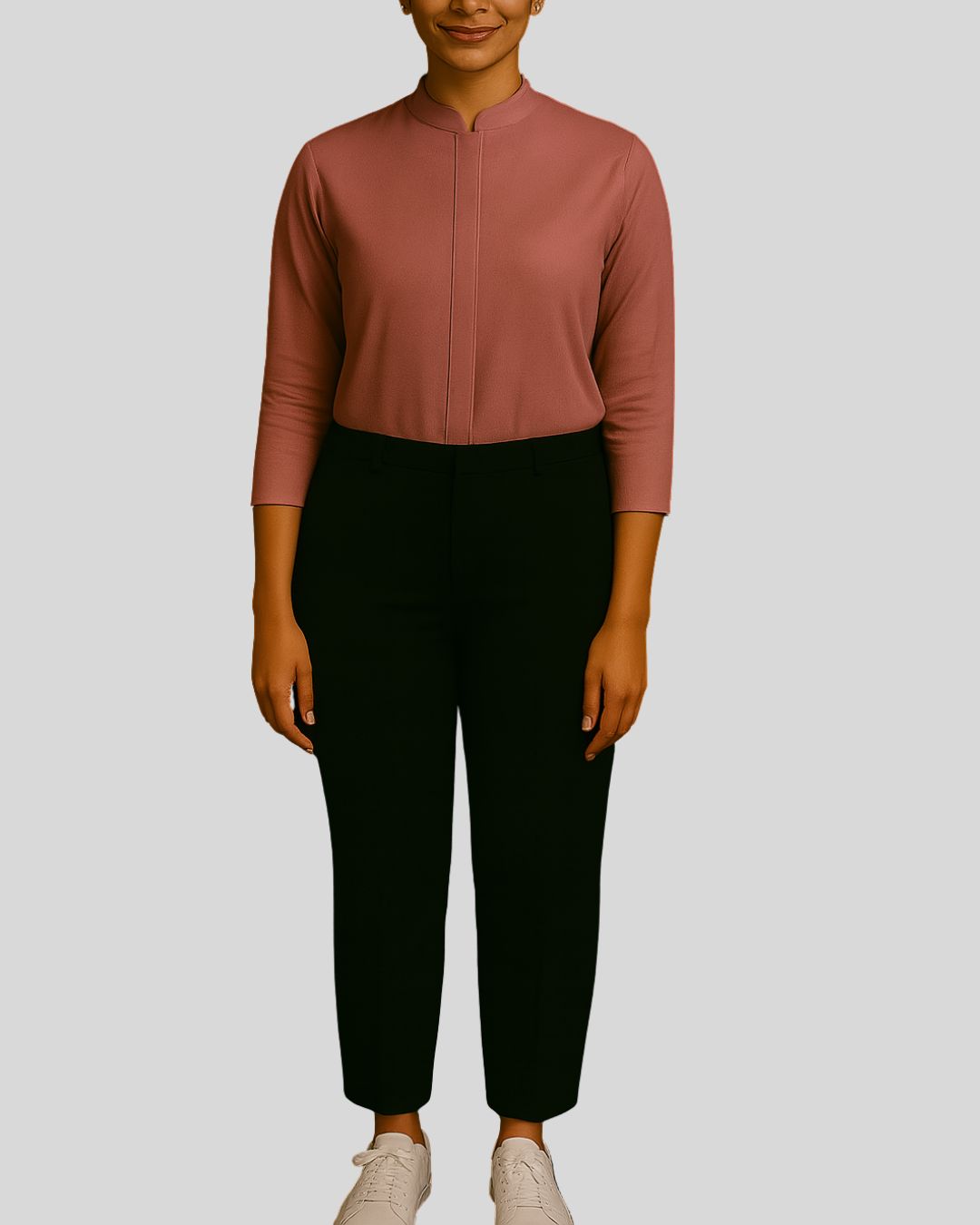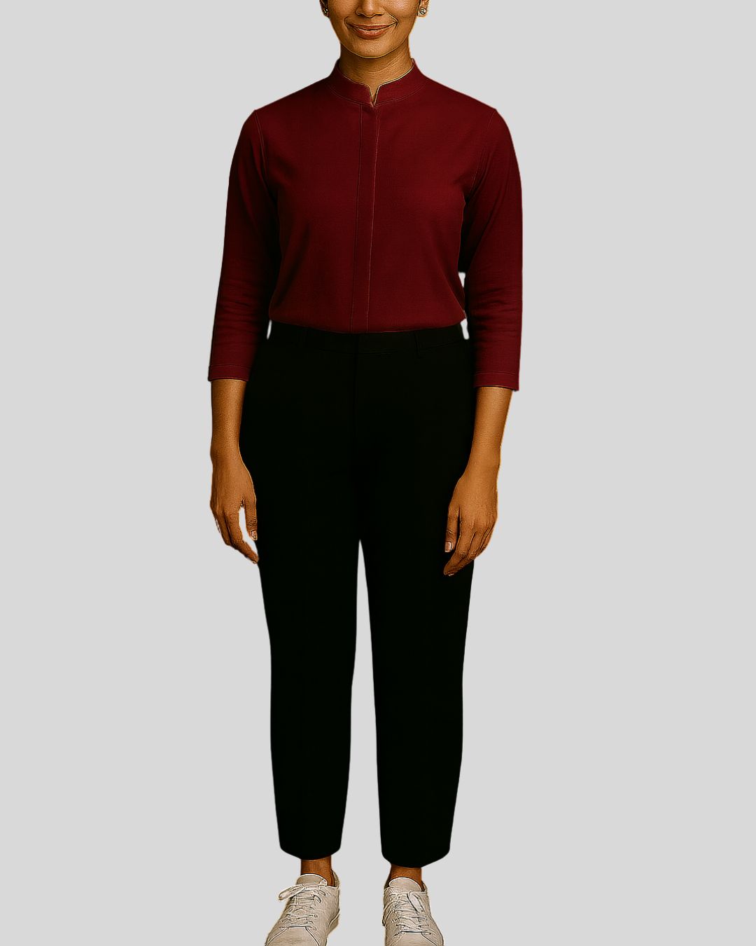 Straight-fit top with a mandarin collar, one-third length sleeves, and a concealed button placket, paired with straight bottoms. Design is wrinkle-free for a neat and polished look.