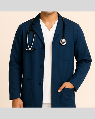 Notched-collar lab coat with a button front and three patch pockets layered over a short-sleeve V-neck scrub top; paired with straight-fit trousers.