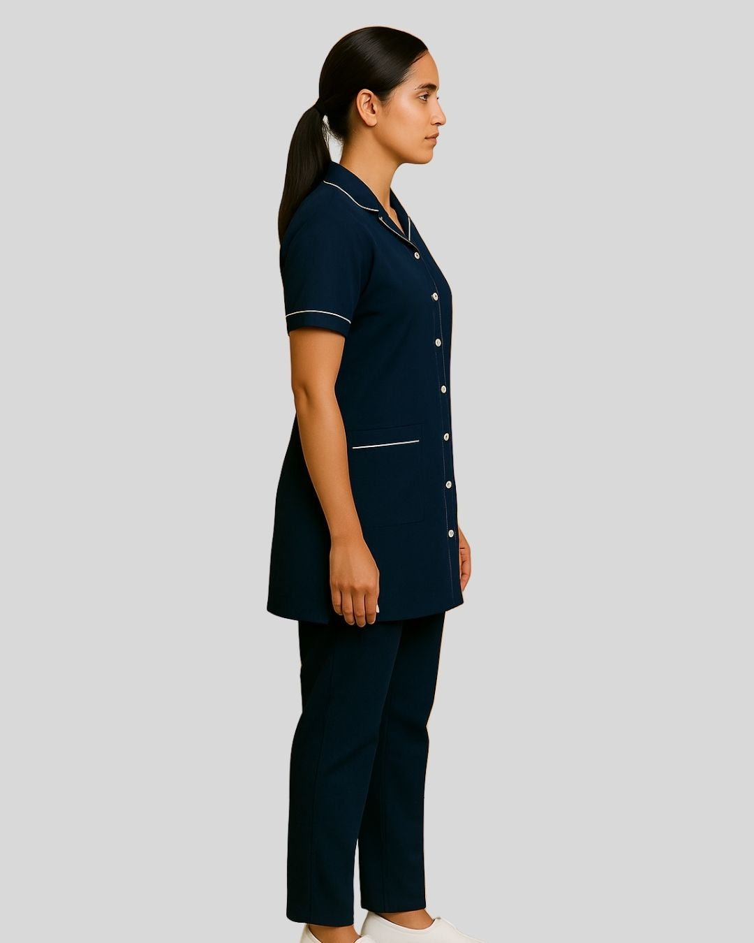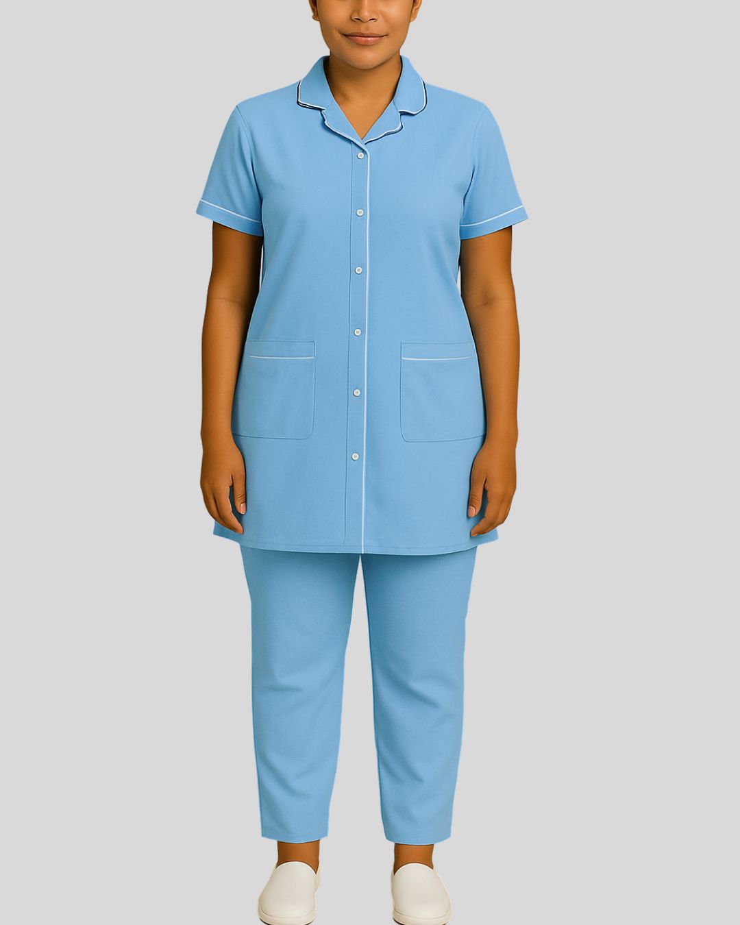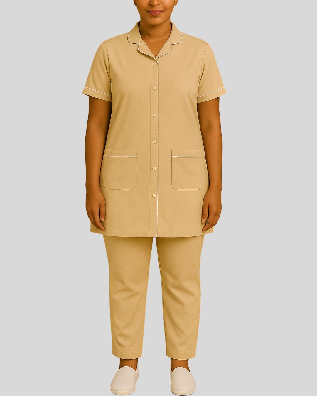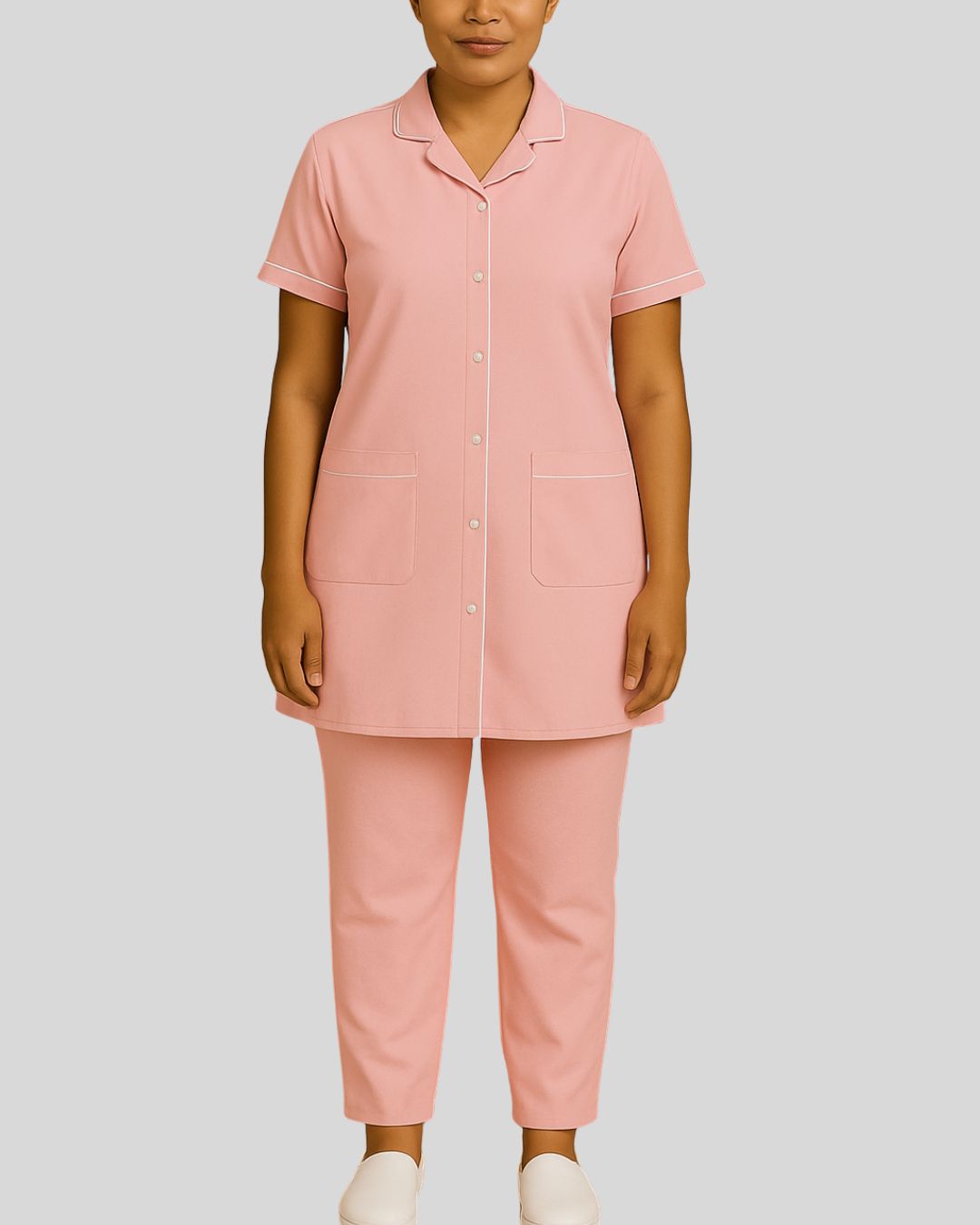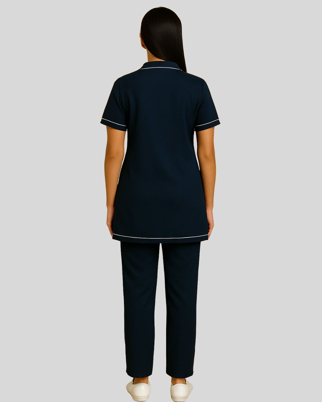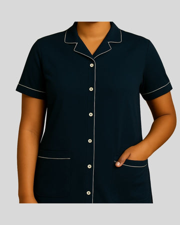 Notched-collar tunic with short sleeves, button-front closure, and dual front patch pockets, trimmed with white piping along the collar, sleeves, and pocket edges. Paired with straight-fit bottoms.