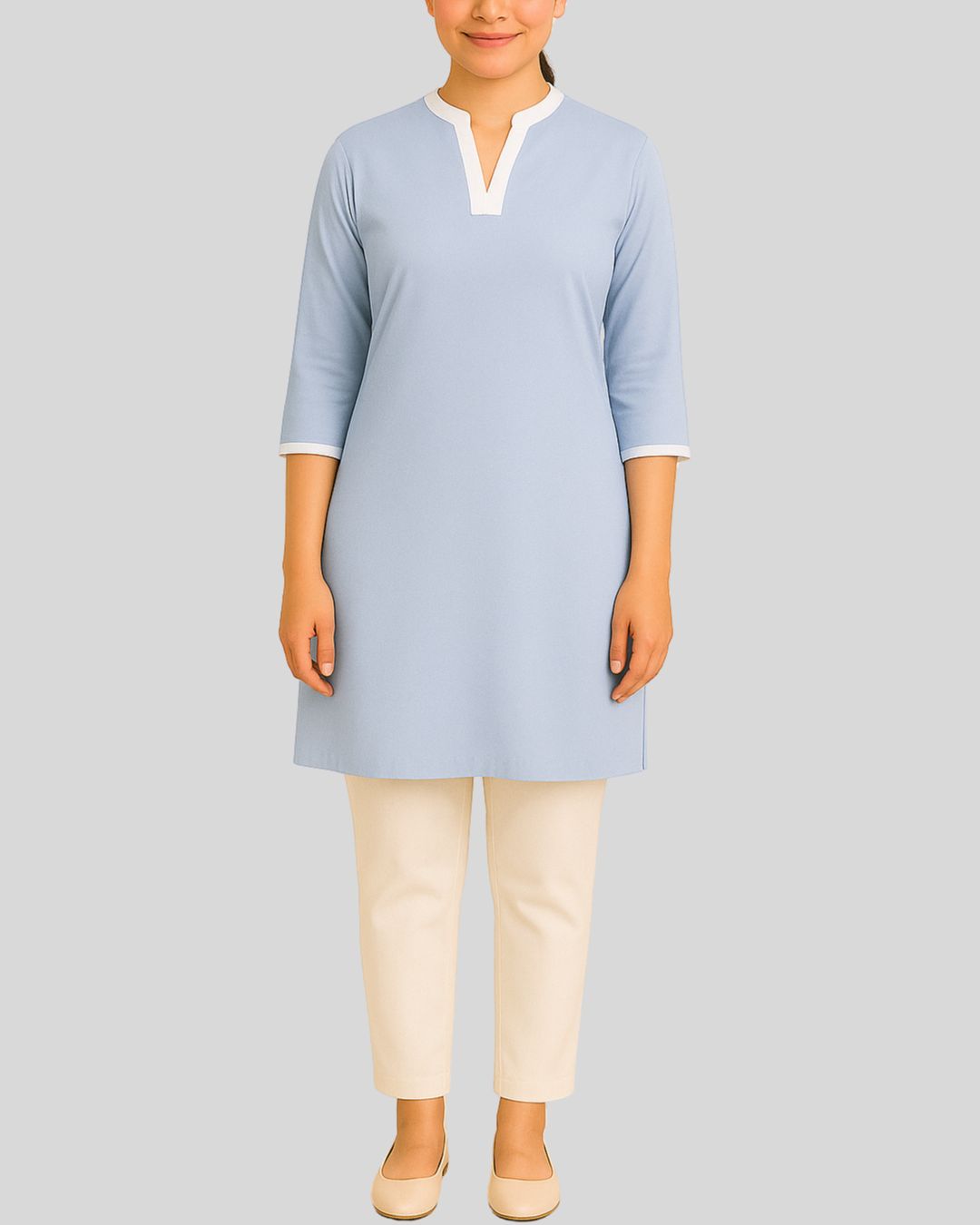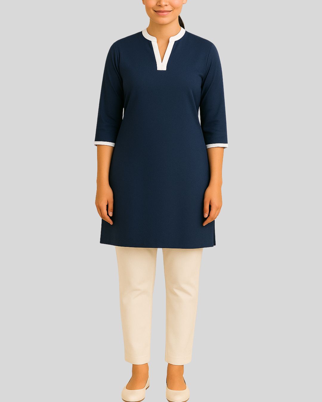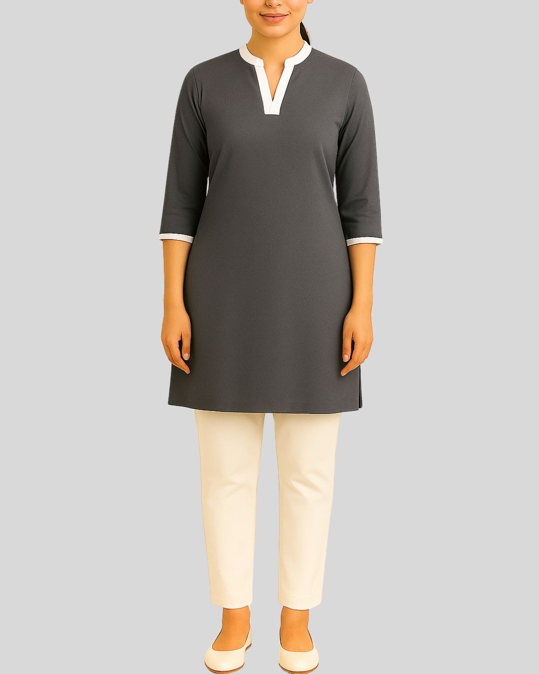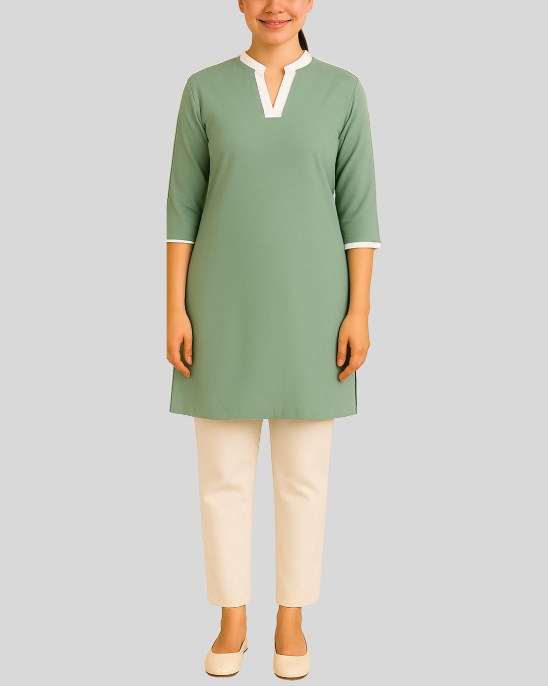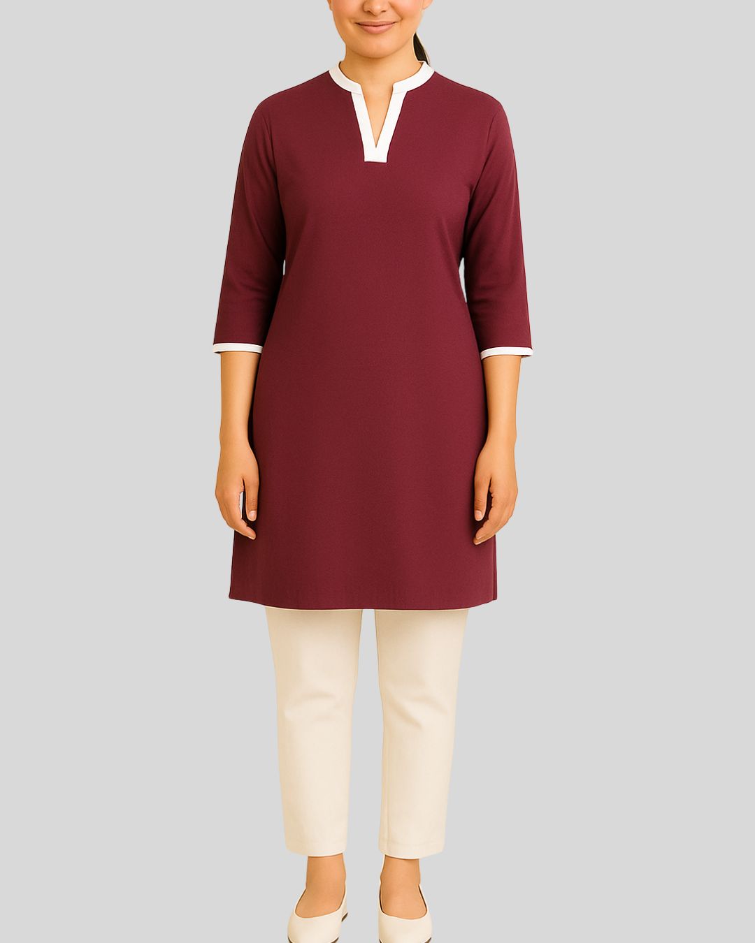 Tunic with a mandarin collar highlighted with white trim and turned-up sleeves, paired with relaxed-fit bottoms. Design is wrinkle-free.