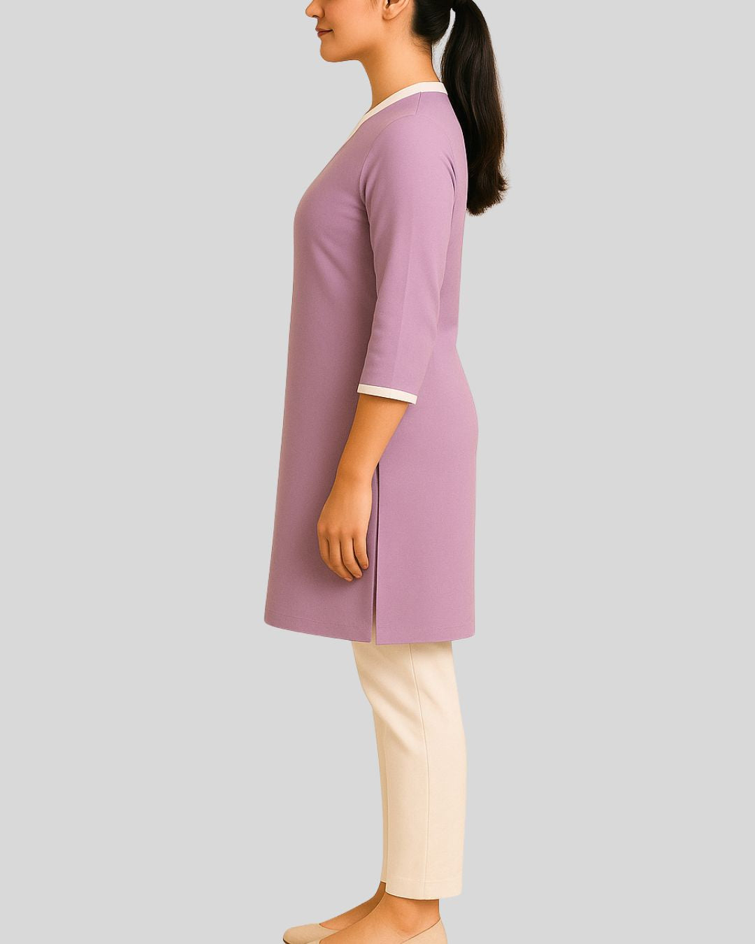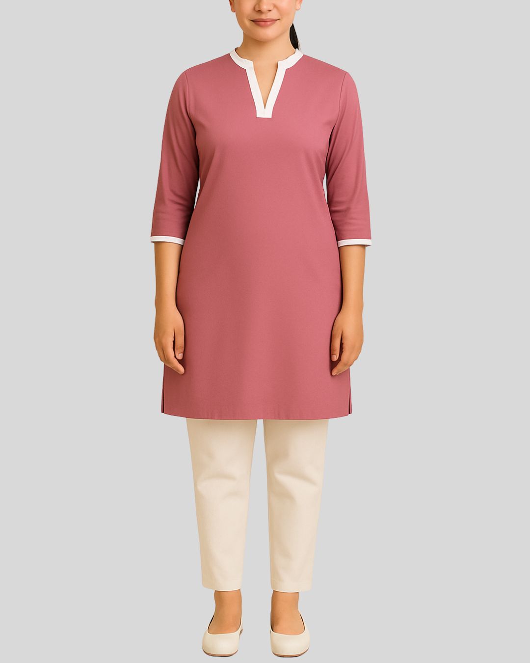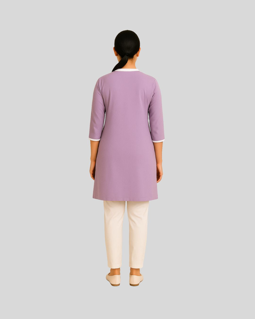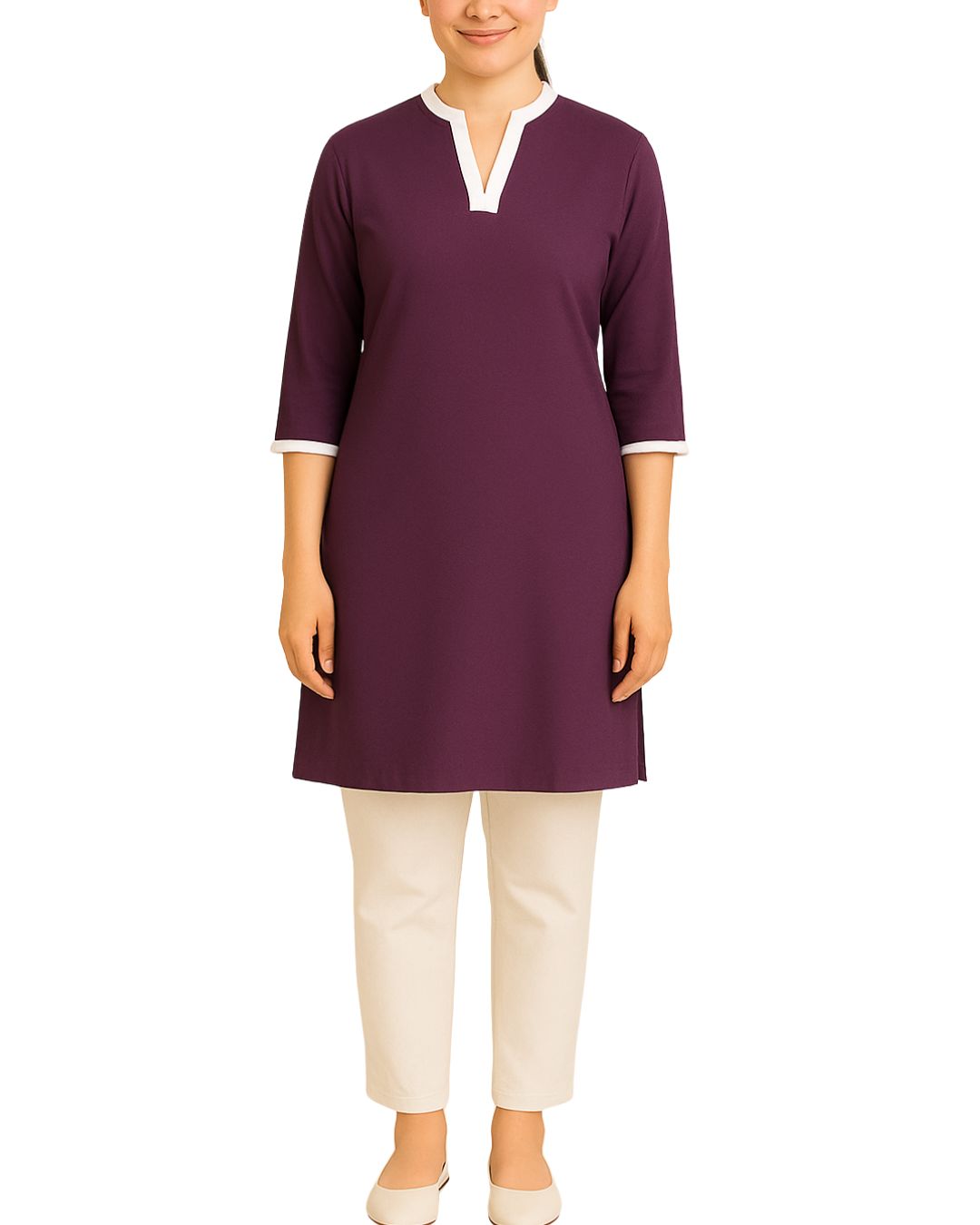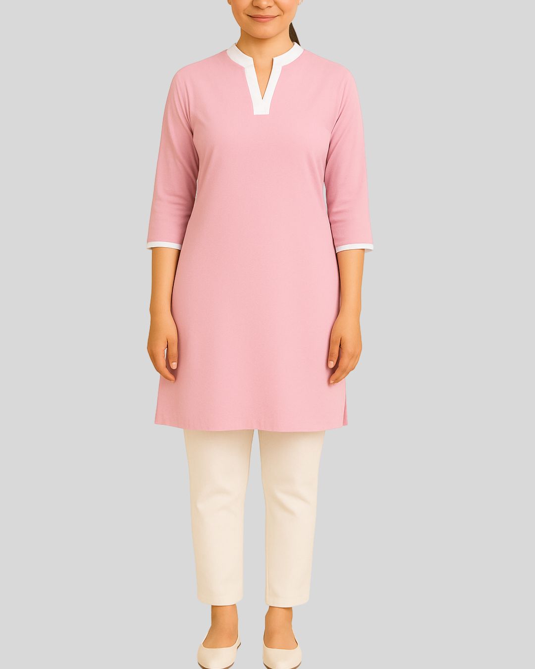 Tunic with a mandarin collar highlighted with white trim and turned-up sleeves, paired with relaxed-fit bottoms. Design is wrinkle-free.
