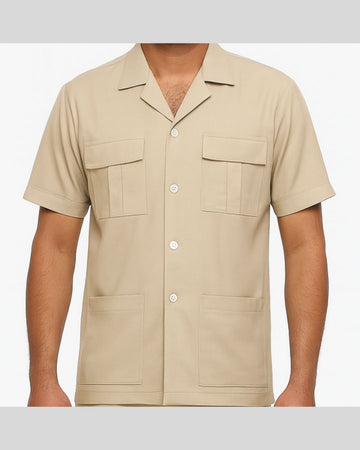 Short-sleeve utility shirt with an open camp collar, two chest pockets with flaps and two lower patch pockets, finished with a button placket. Paired with straight-fit easy-care trousers.