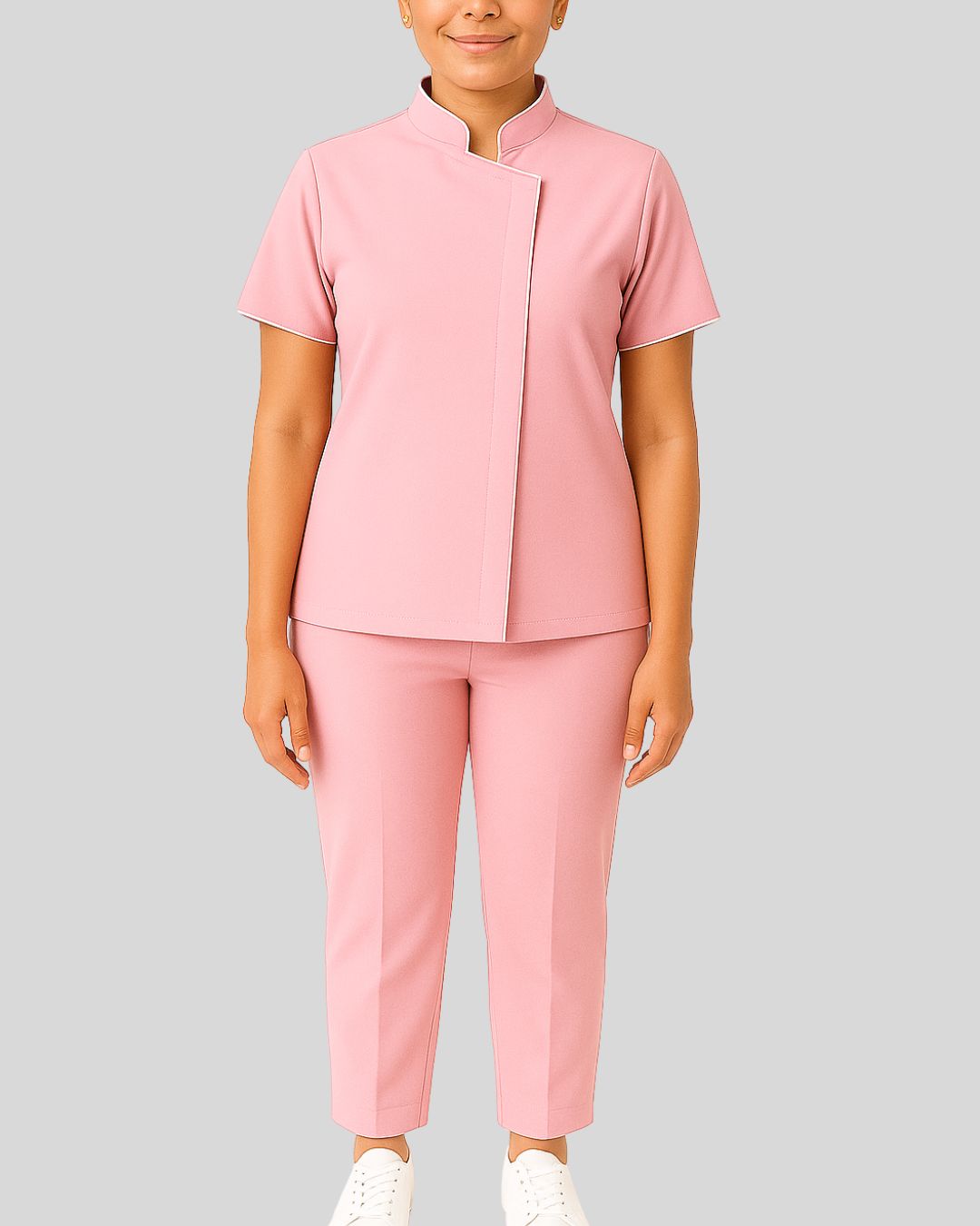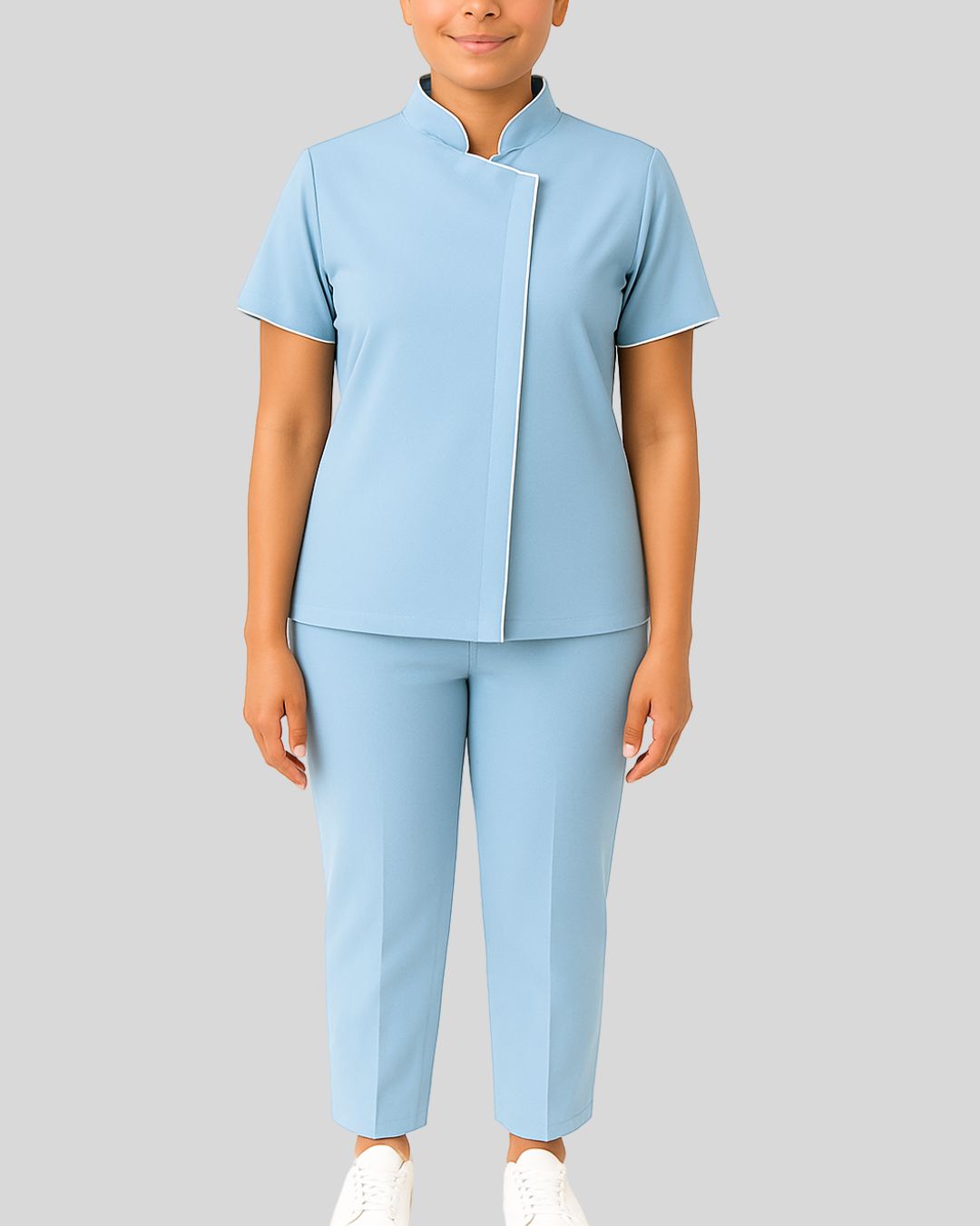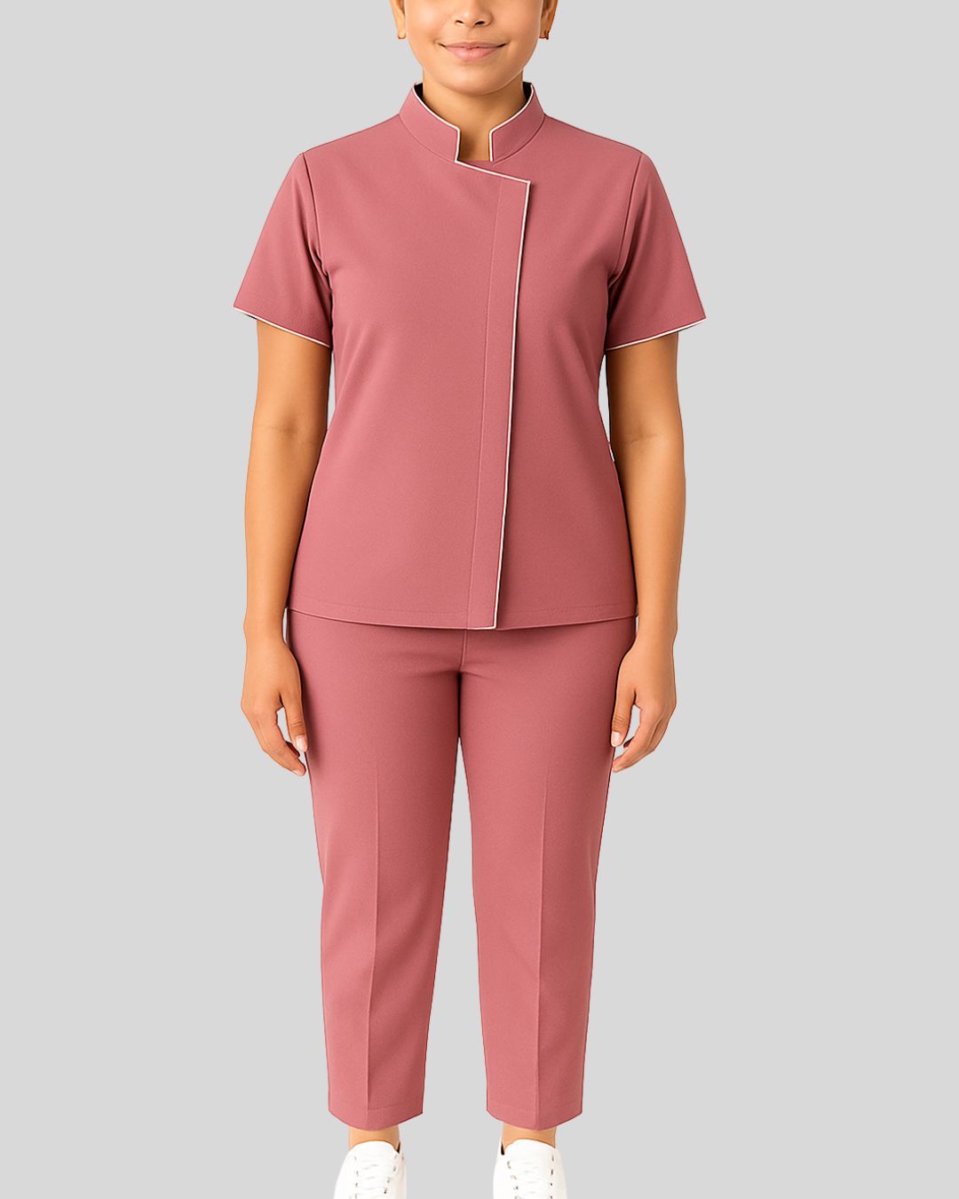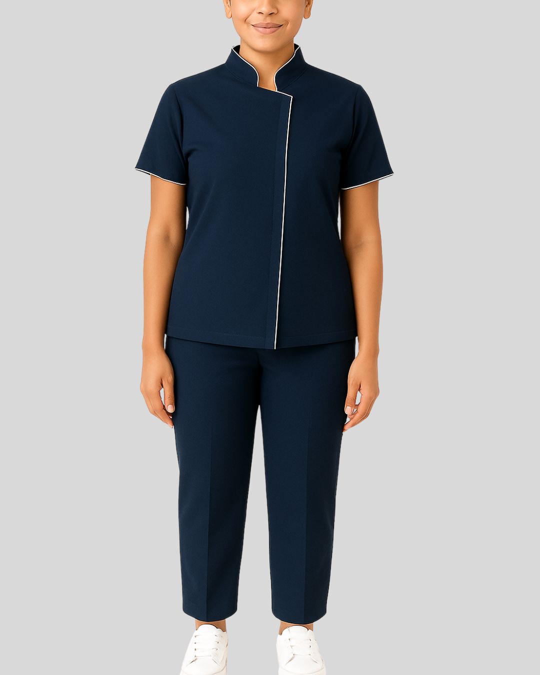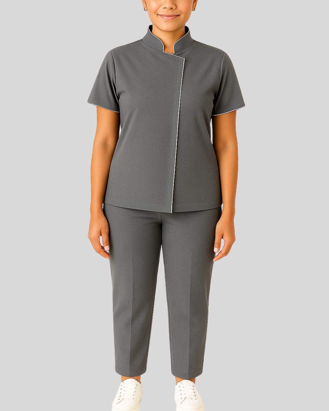 Uniform top with a mandarin collar, V-slit neckline, and asymmetrical contrast-piped panel, paired with tapered ankle-length bottoms. Design is water-resistant.