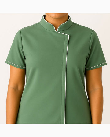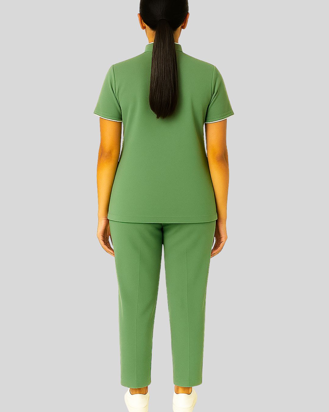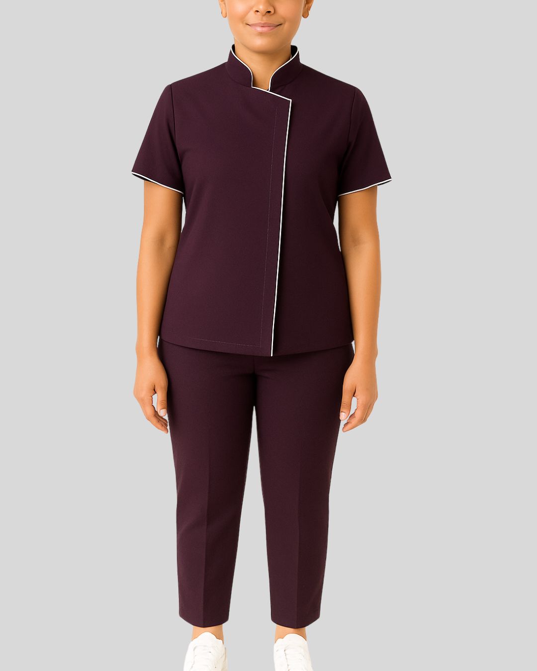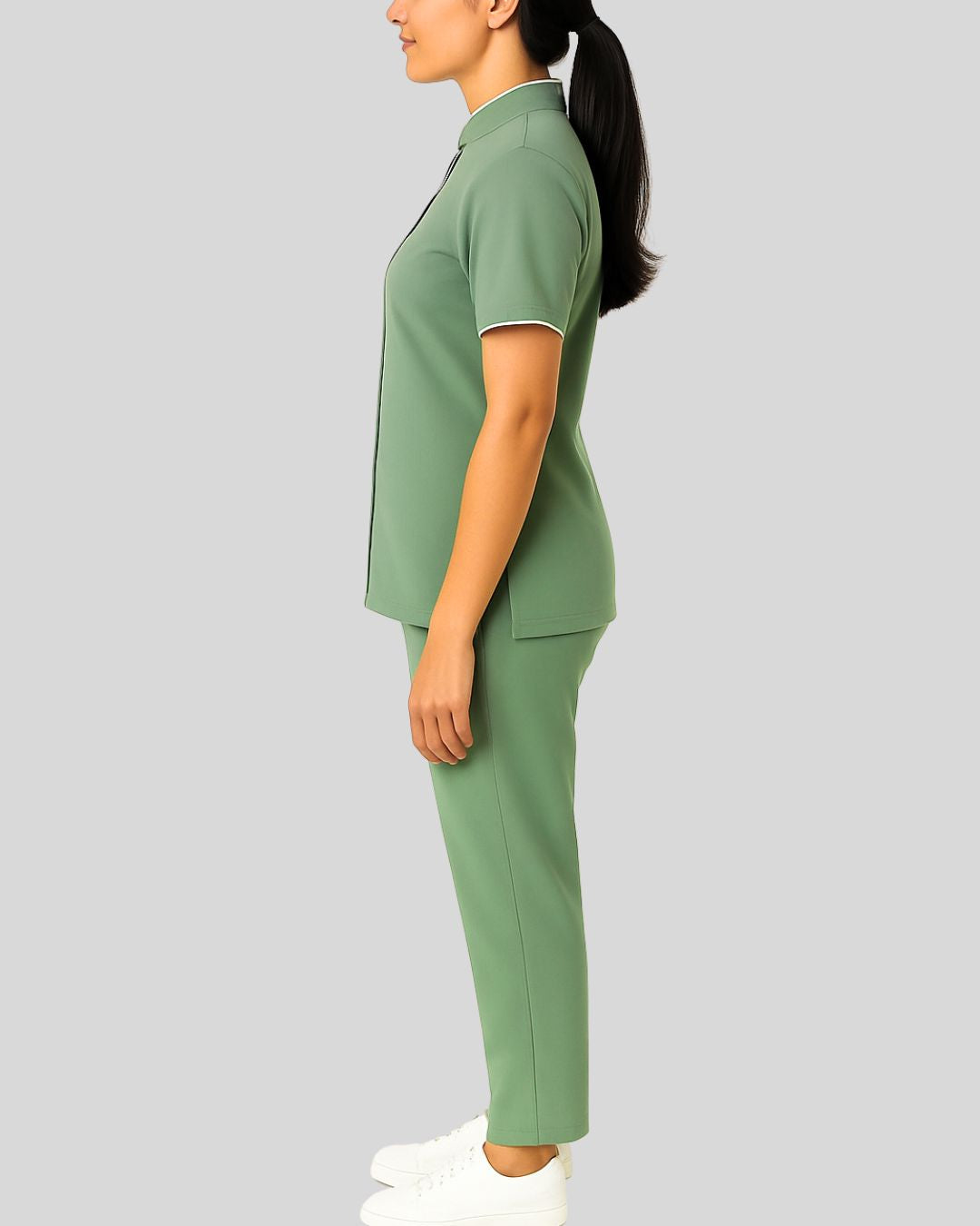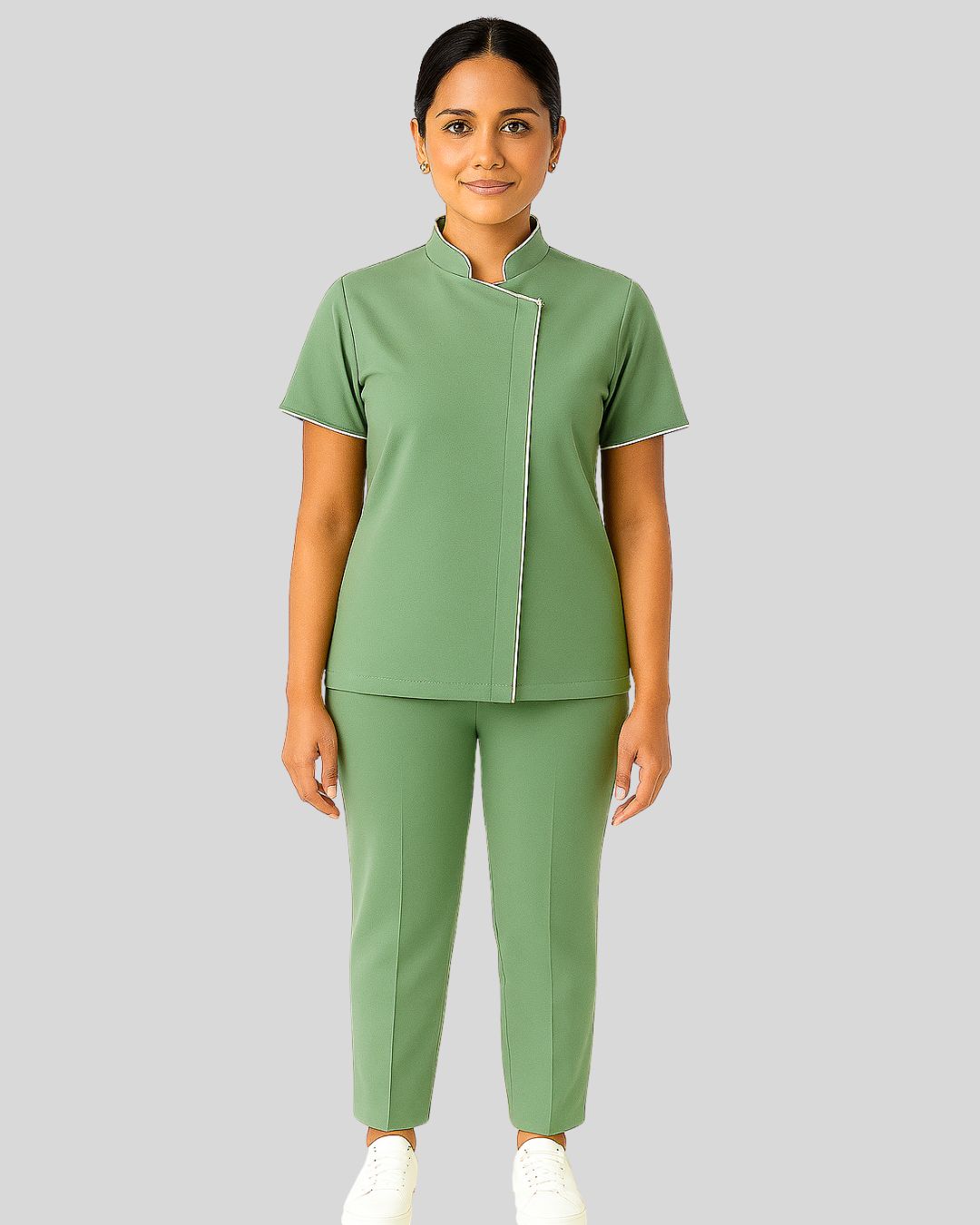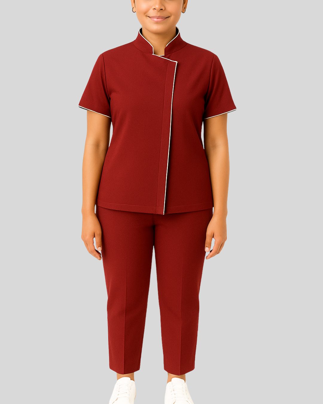 Uniform top with a mandarin collar, V-slit neckline, and asymmetrical contrast-piped panel, paired with tapered ankle-length bottoms. Design is water-resistant.