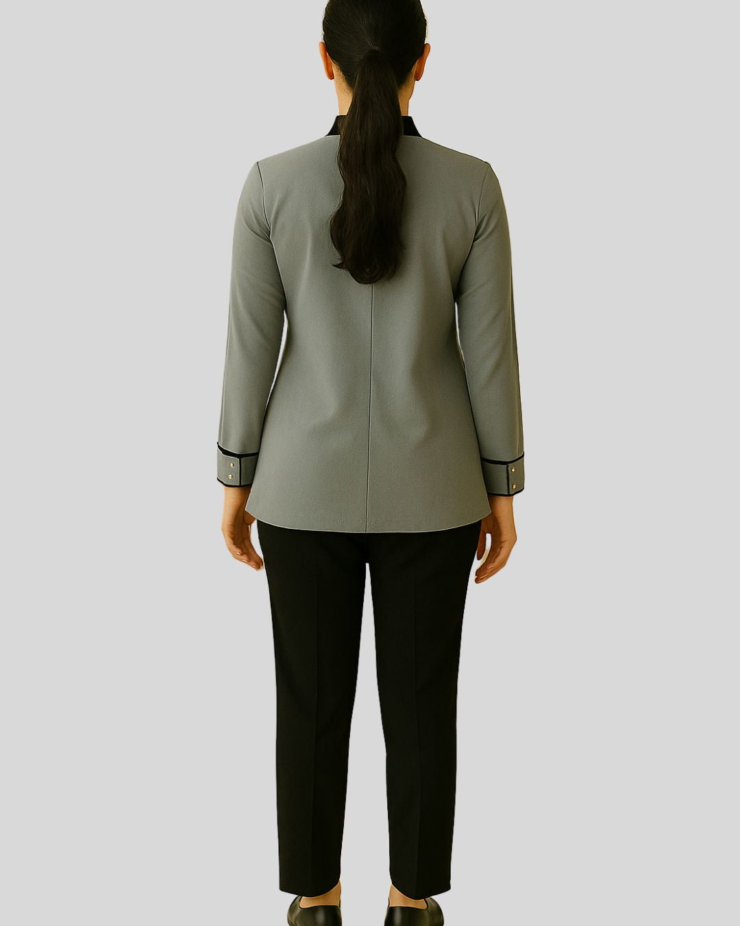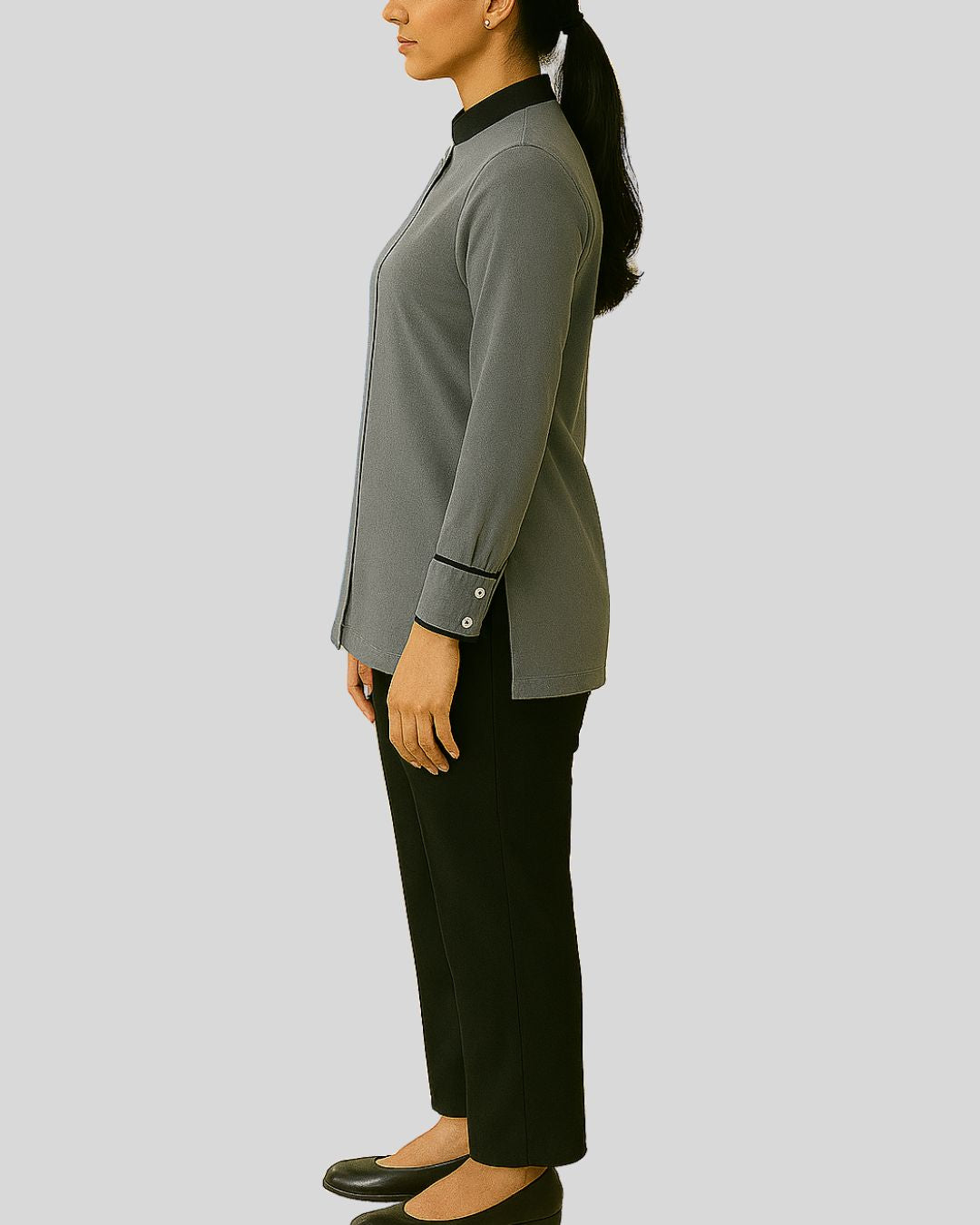 Minimalist long-sleeve tunic with a black stand collar and concealed placket, paired with straight bottoms. Design is wrinkle-free for a modern look.