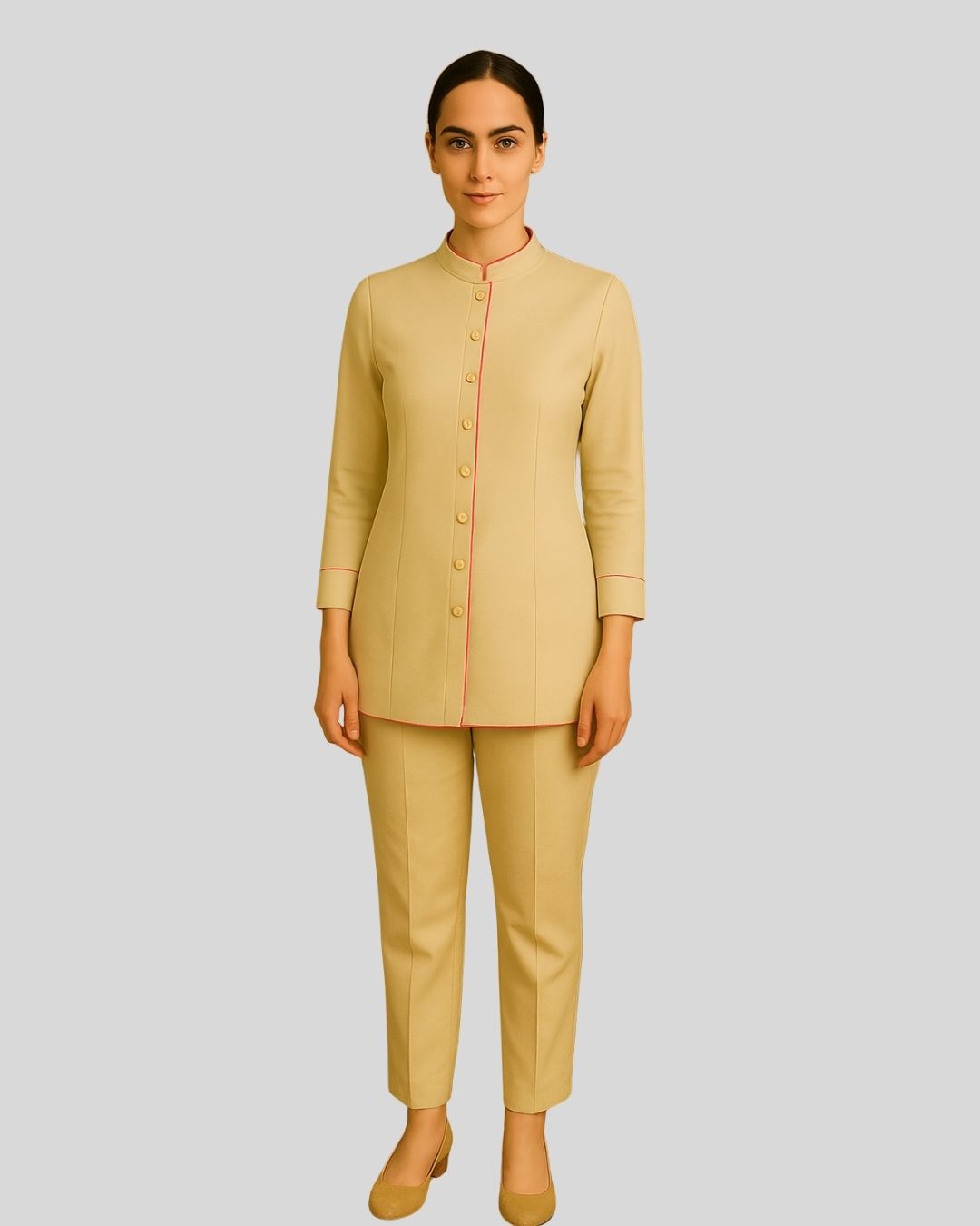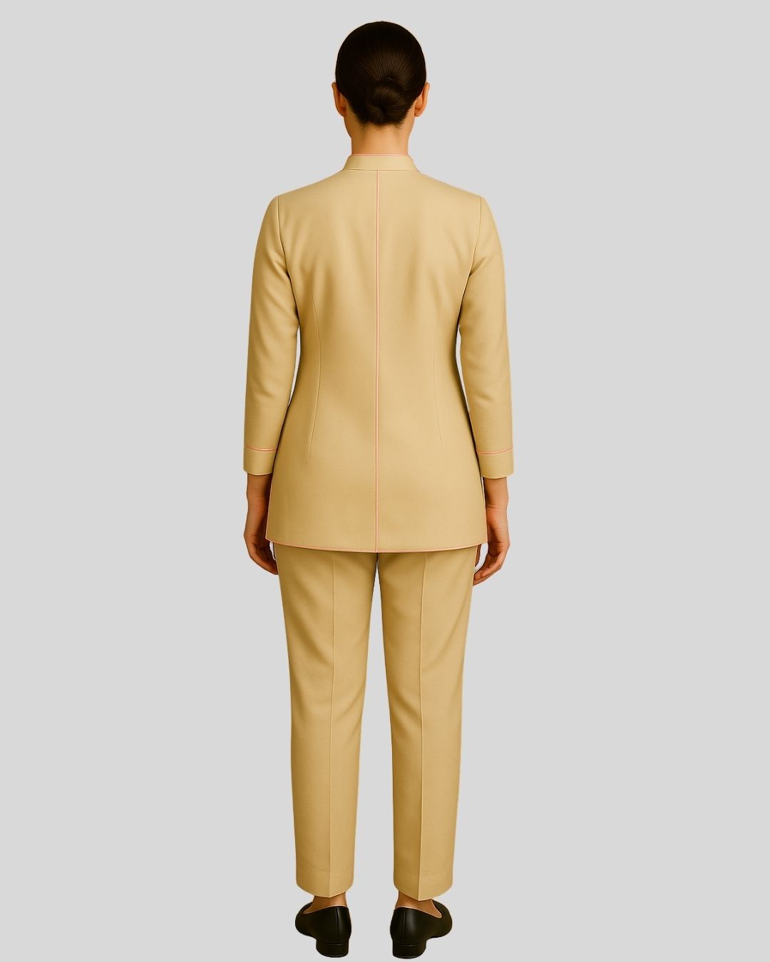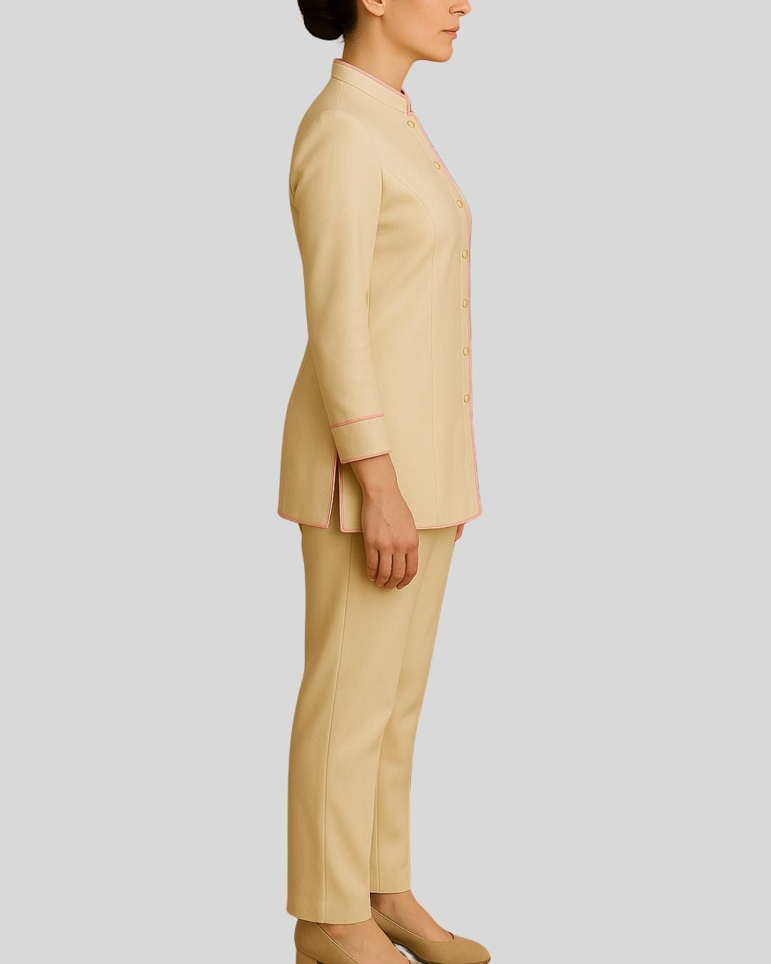 Mandarin-collar tunic with full button placket and three-quarter sleeves, trimmed with contrast pink piping along the collar, placket and cuffs. Paired with straight-fit wrinkle-free bottoms.