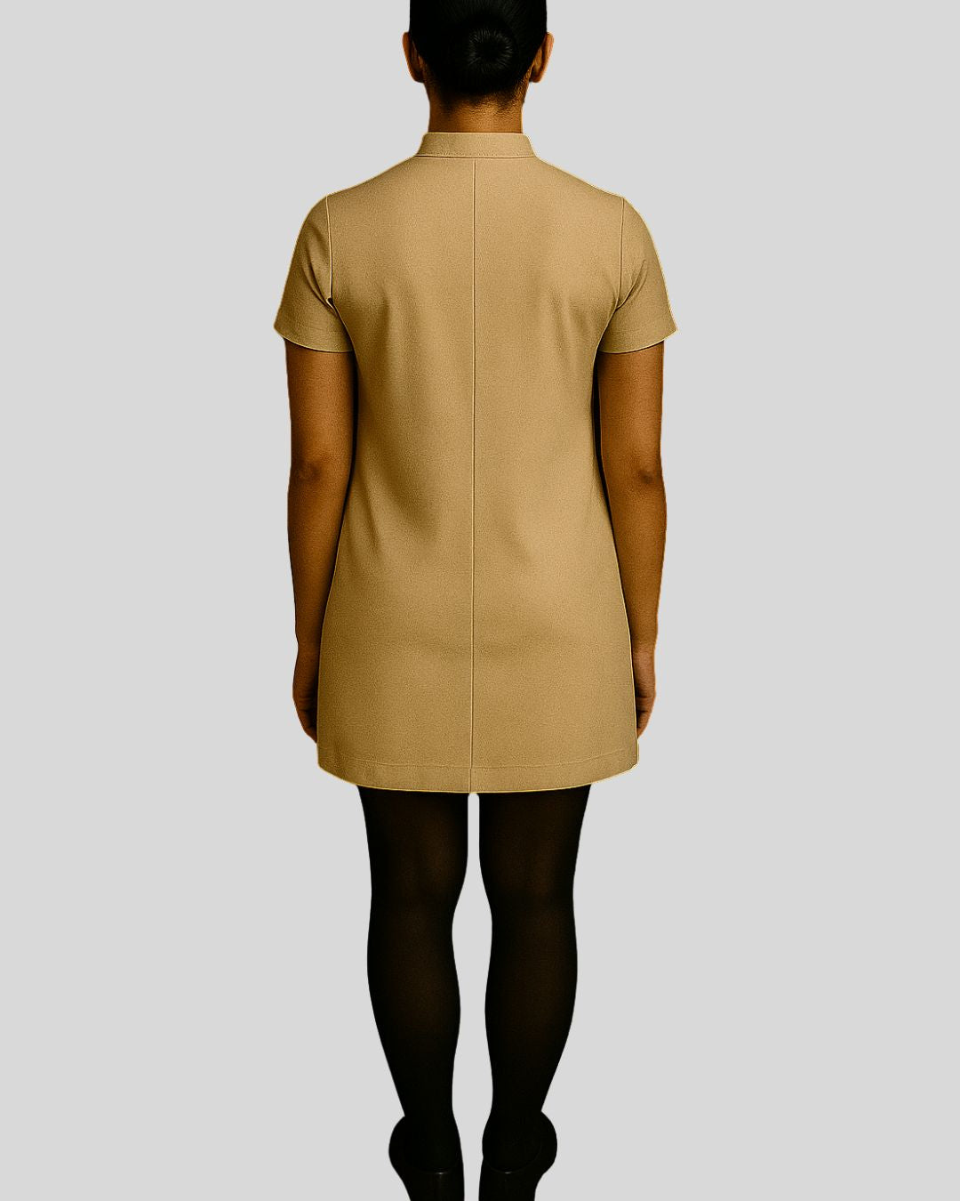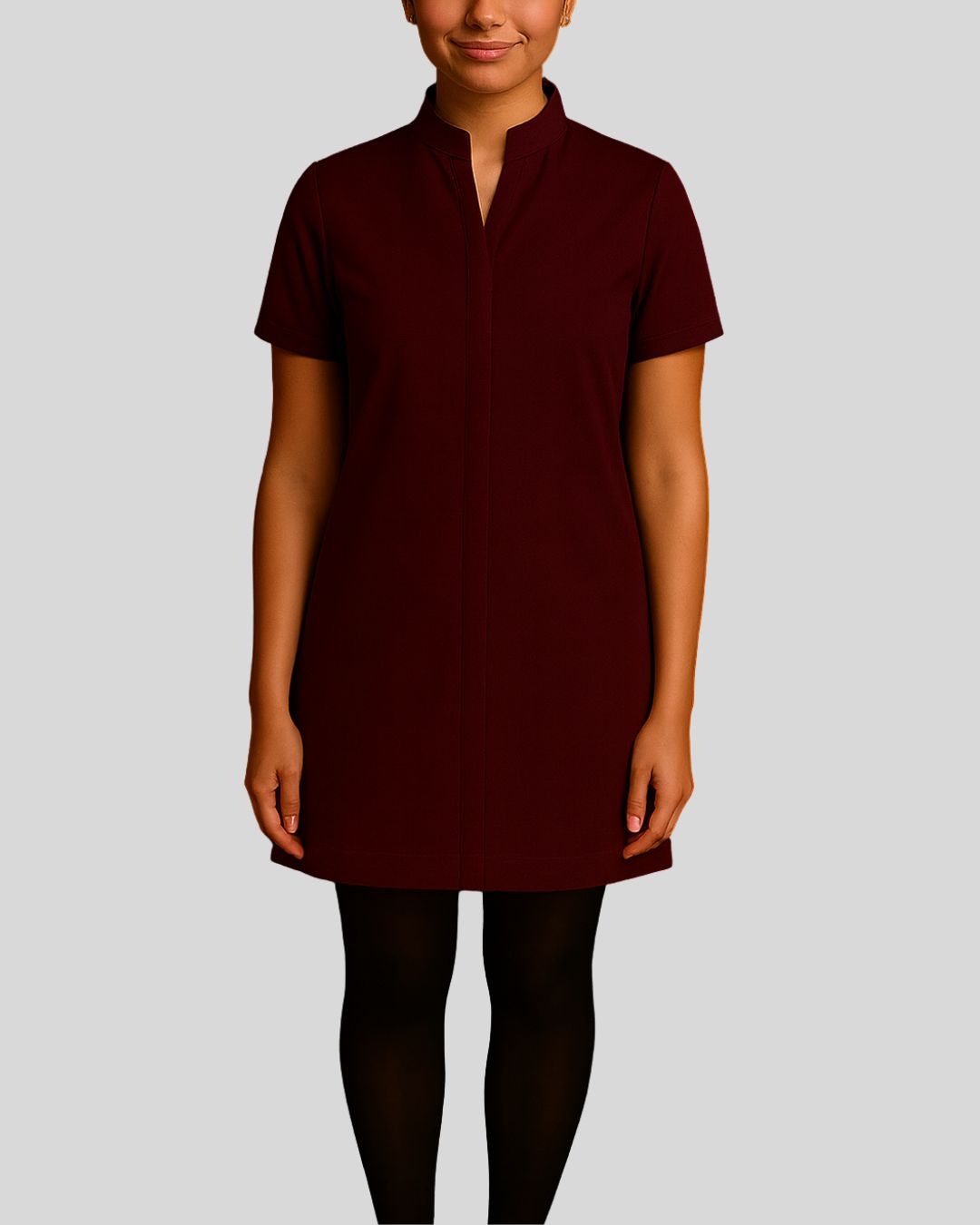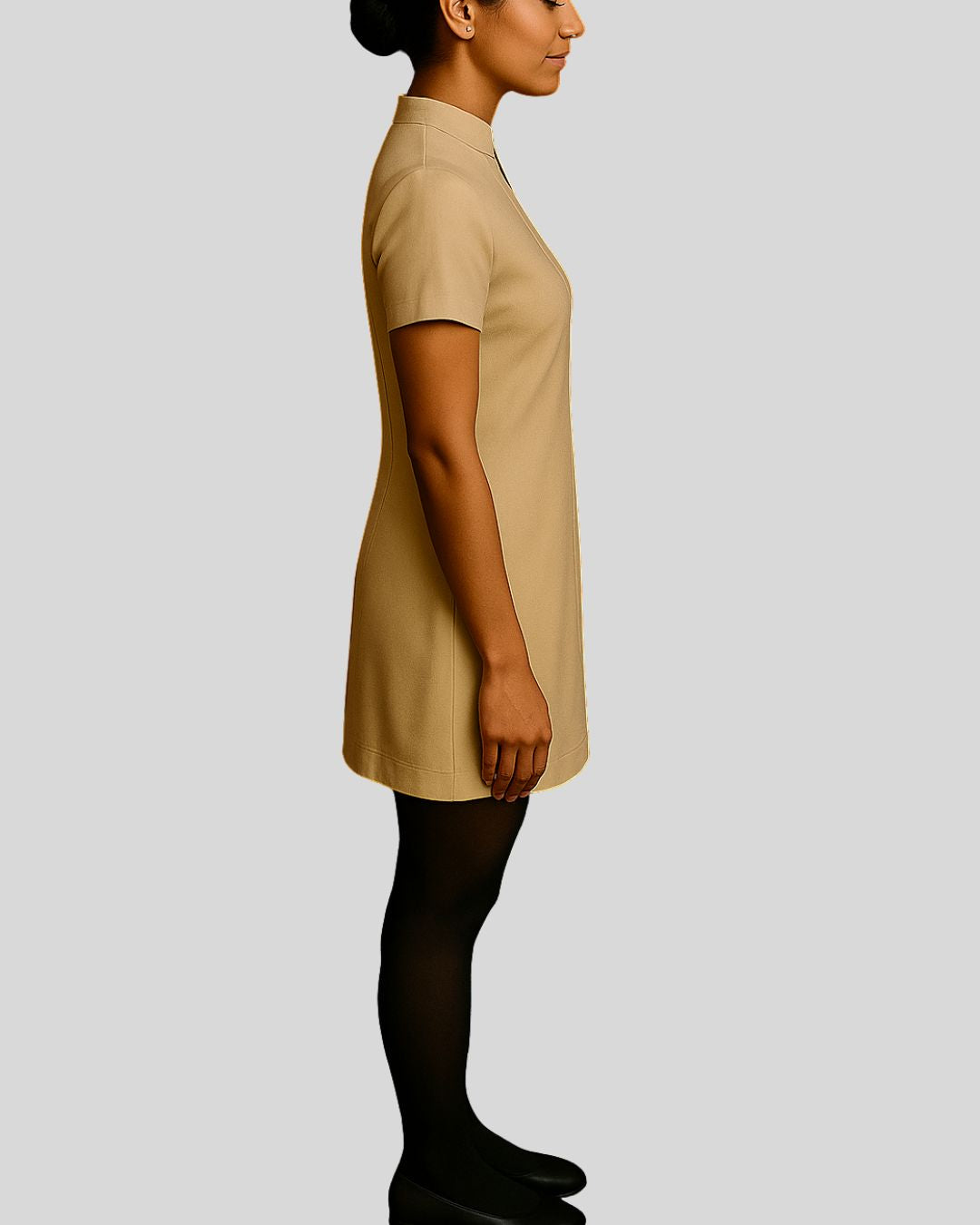One-piece uniform with a knee-length straight silhouette and short sleeves. Outfit is wrinkle-free and designed for professional ease.