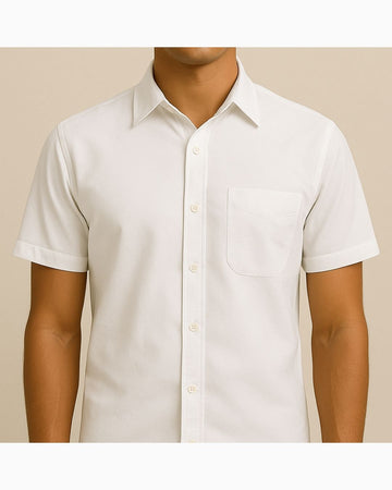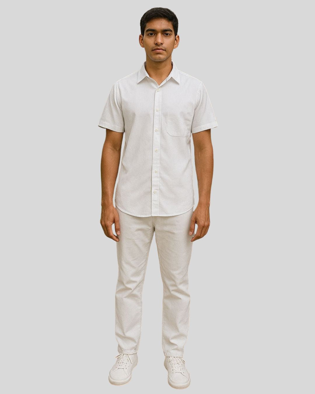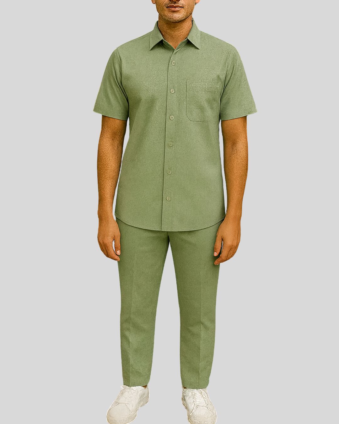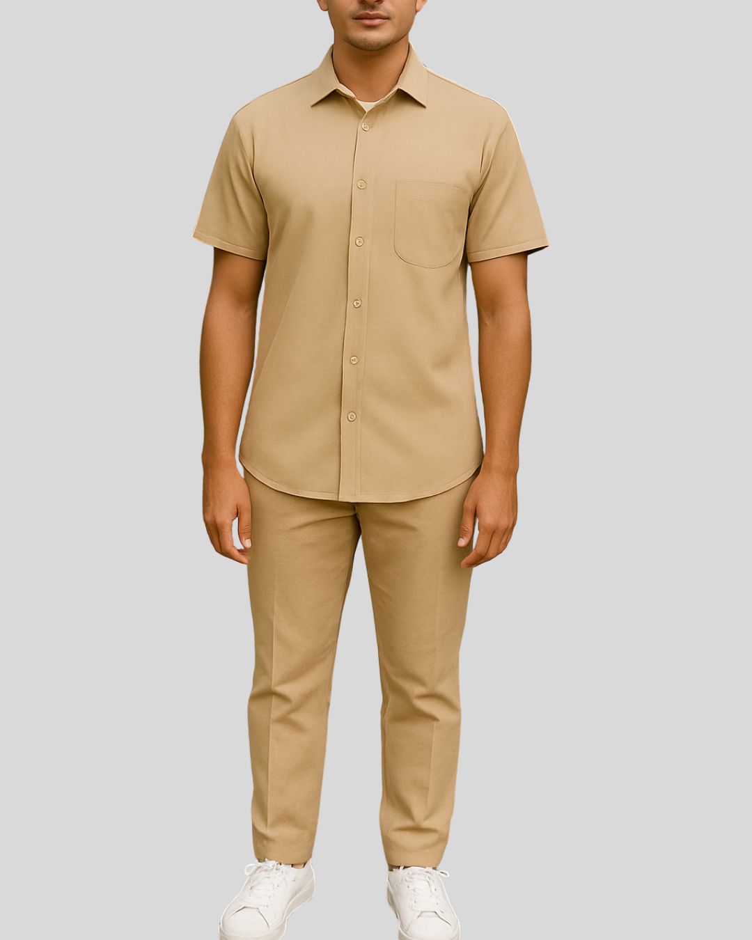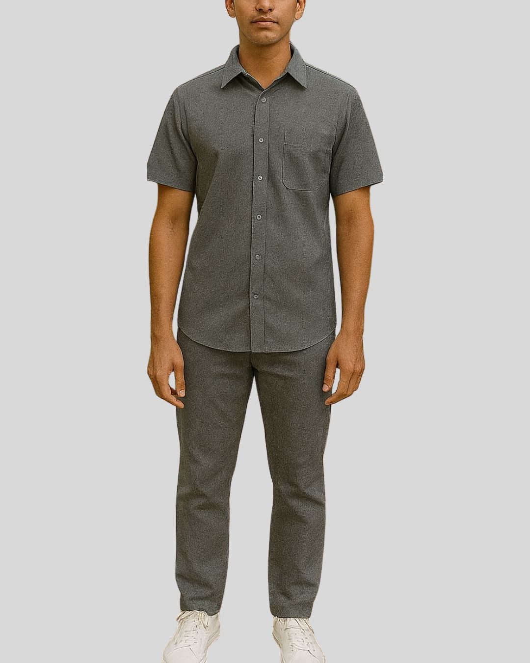 Regular shirt with a classic pointed collar, short sleeves, and a button-up front, paired with straight-cut bottoms. Style is water-resistant and easy-care for everyday wear.