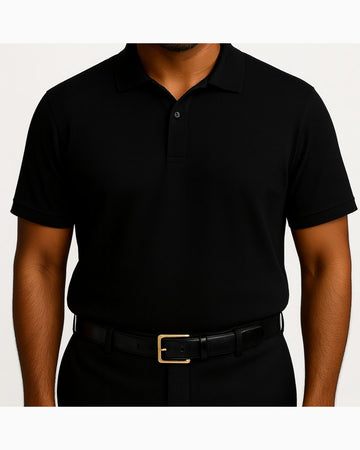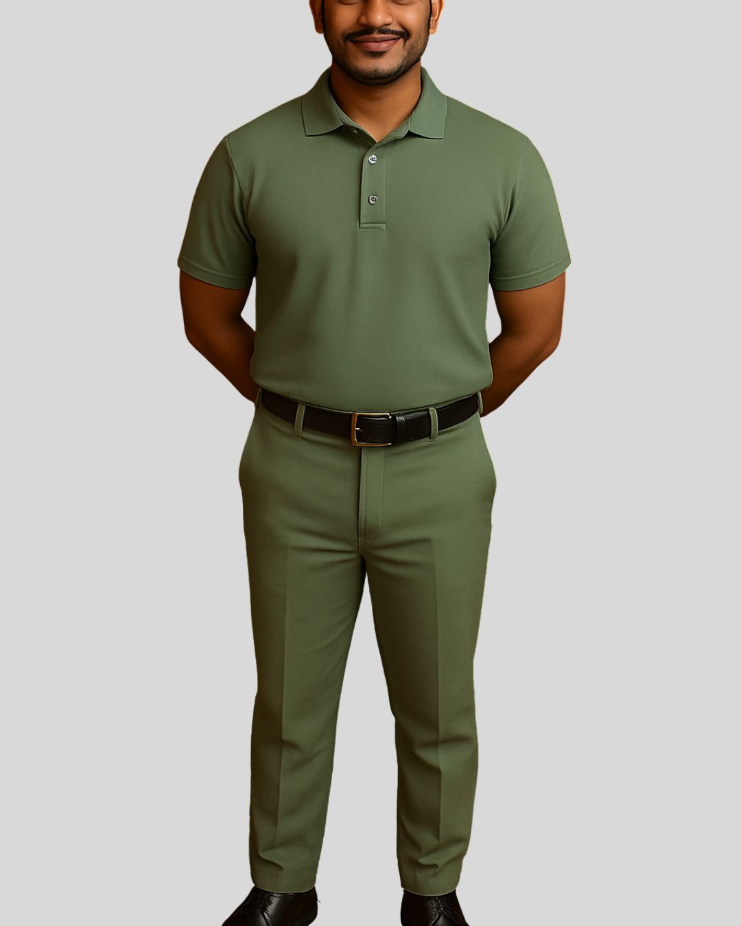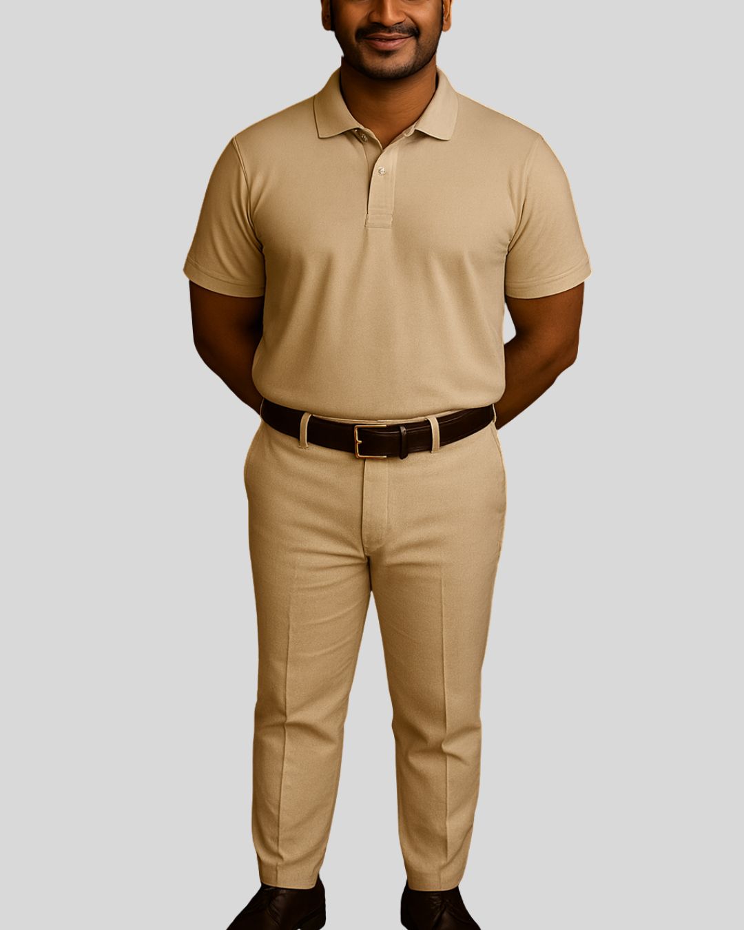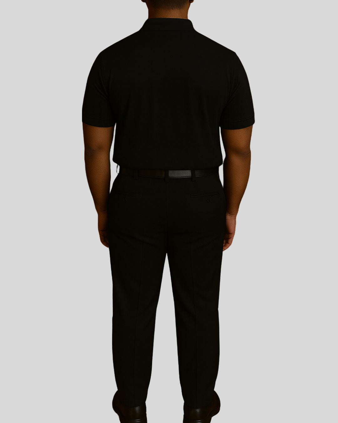 Short-sleeved polo-neck top with a button placket, paired with tailored bottoms. Uniform is wrinkle-free and water-resistant for all-day comfort.