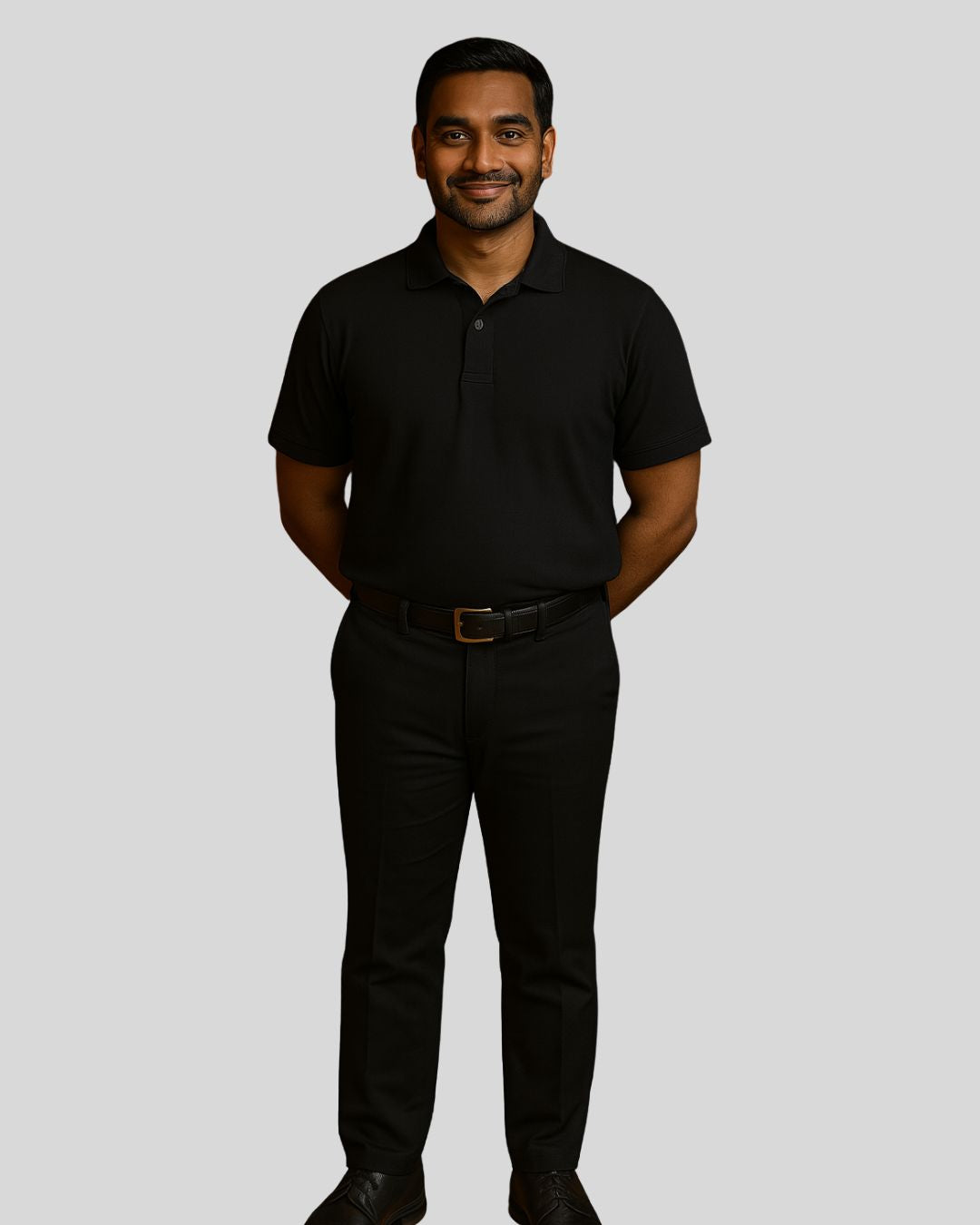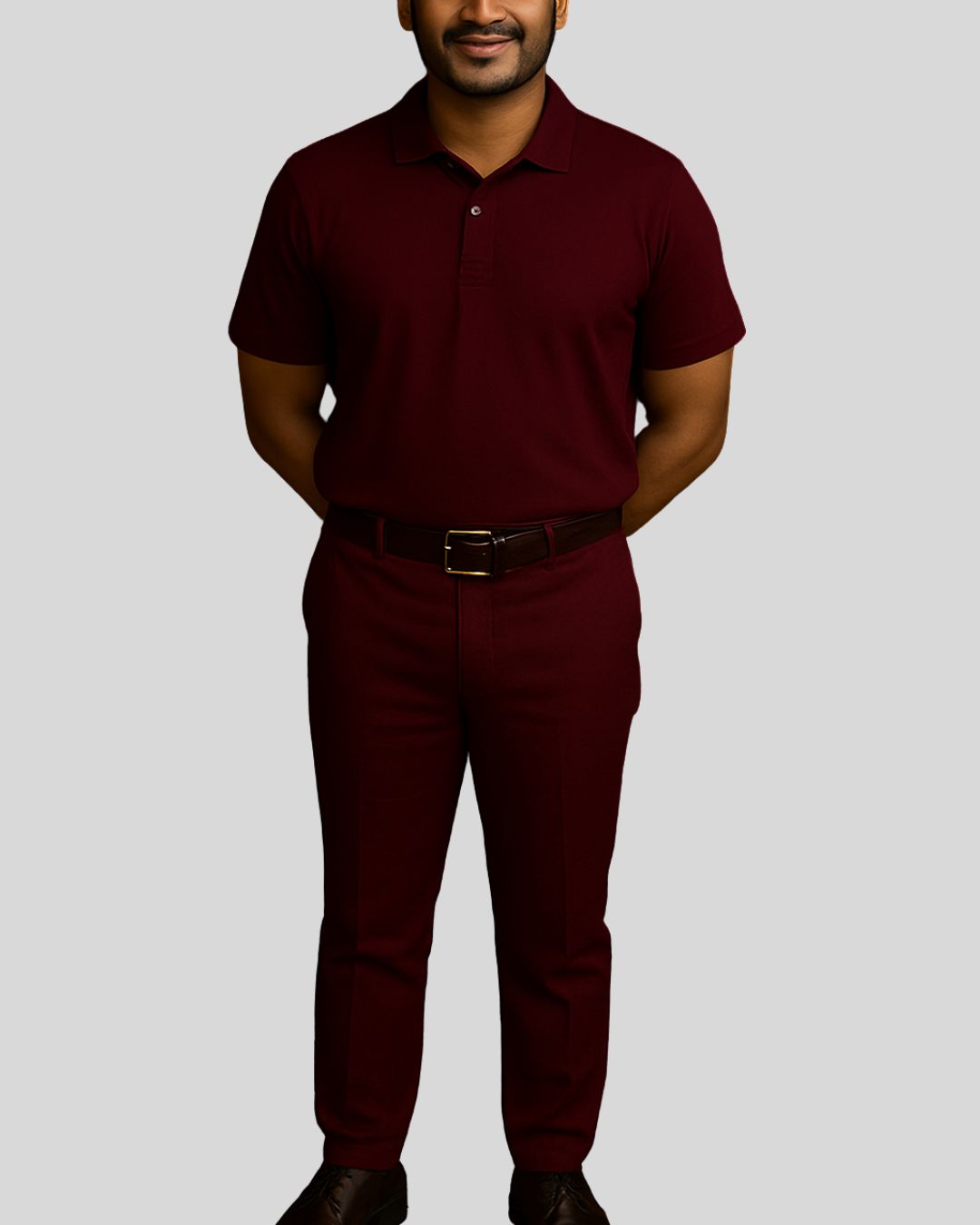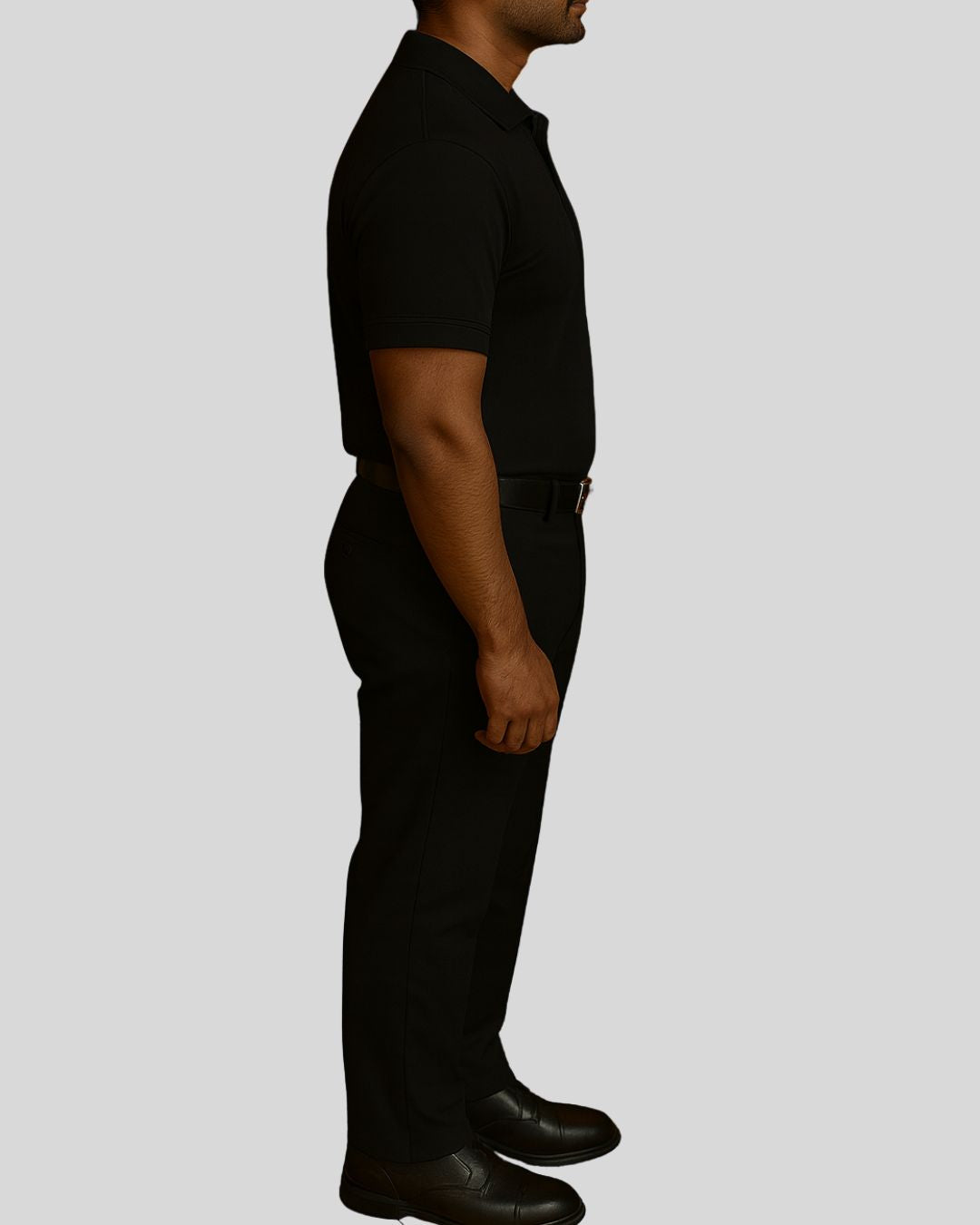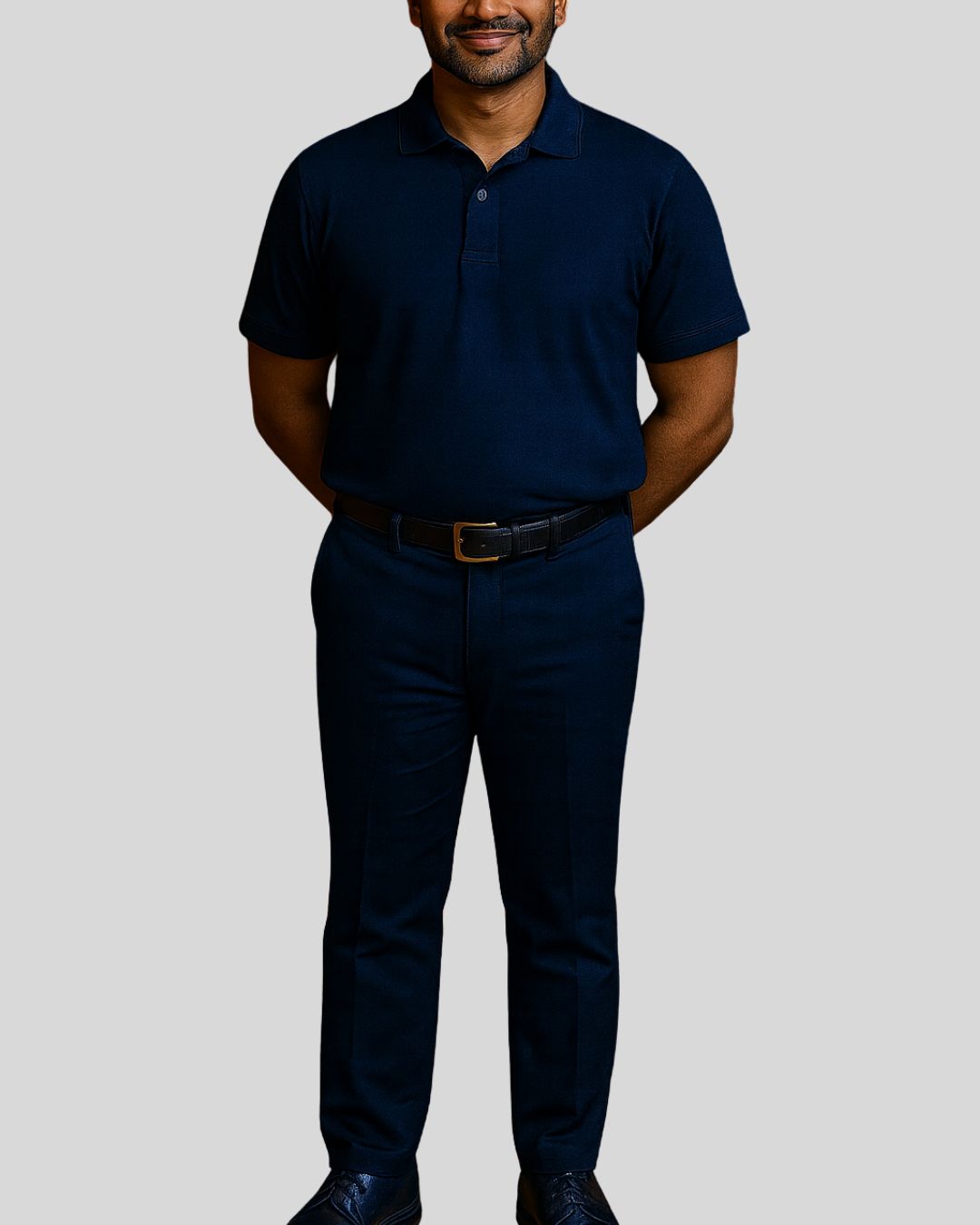 Short-sleeved polo-neck top with a button placket, paired with tailored bottoms. Uniform is wrinkle-free and water-resistant for all-day comfort.