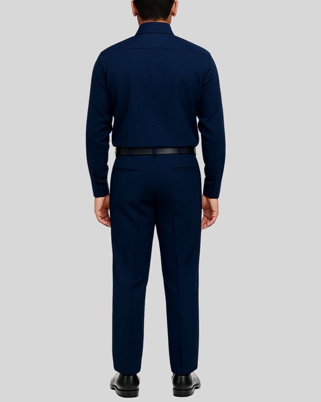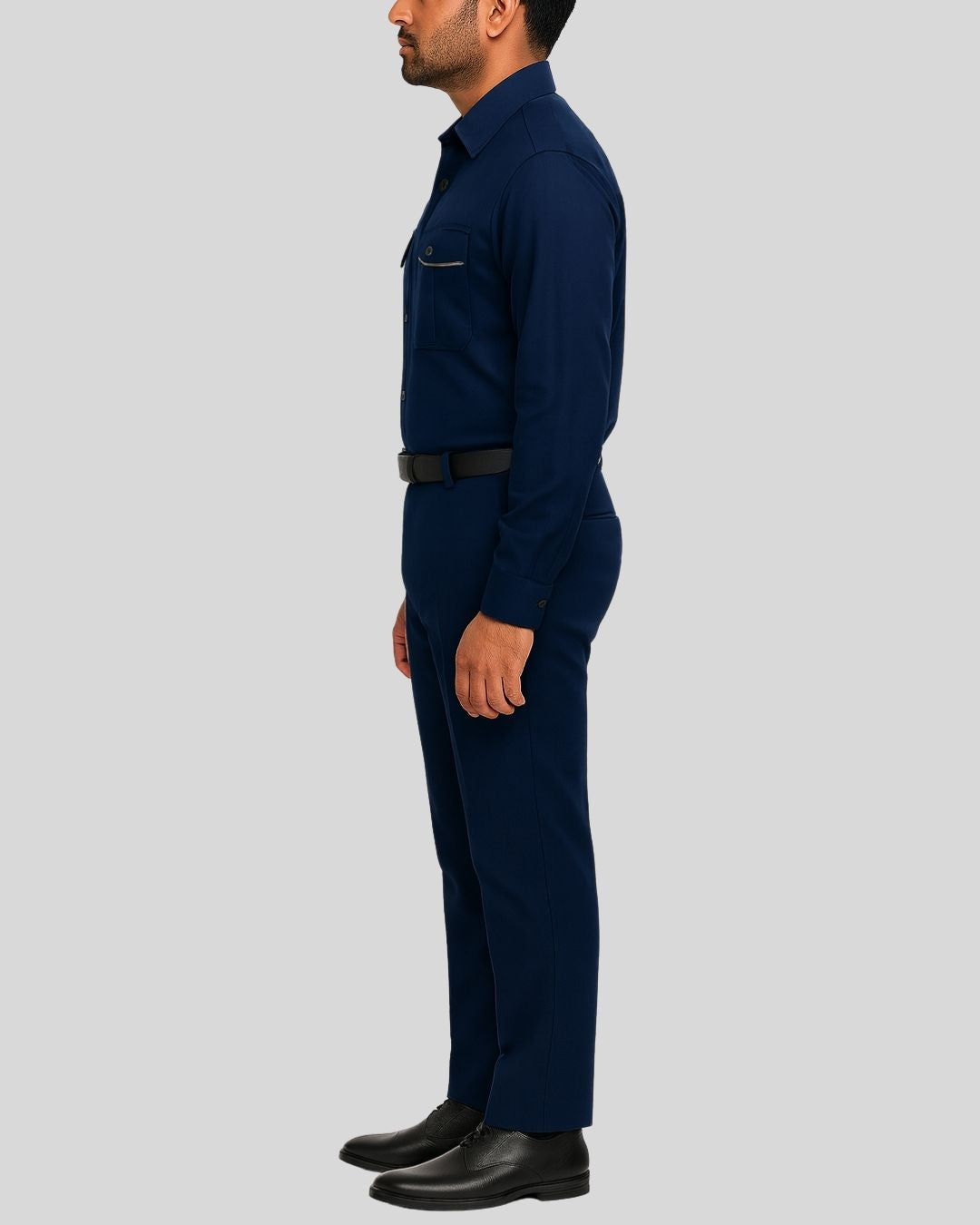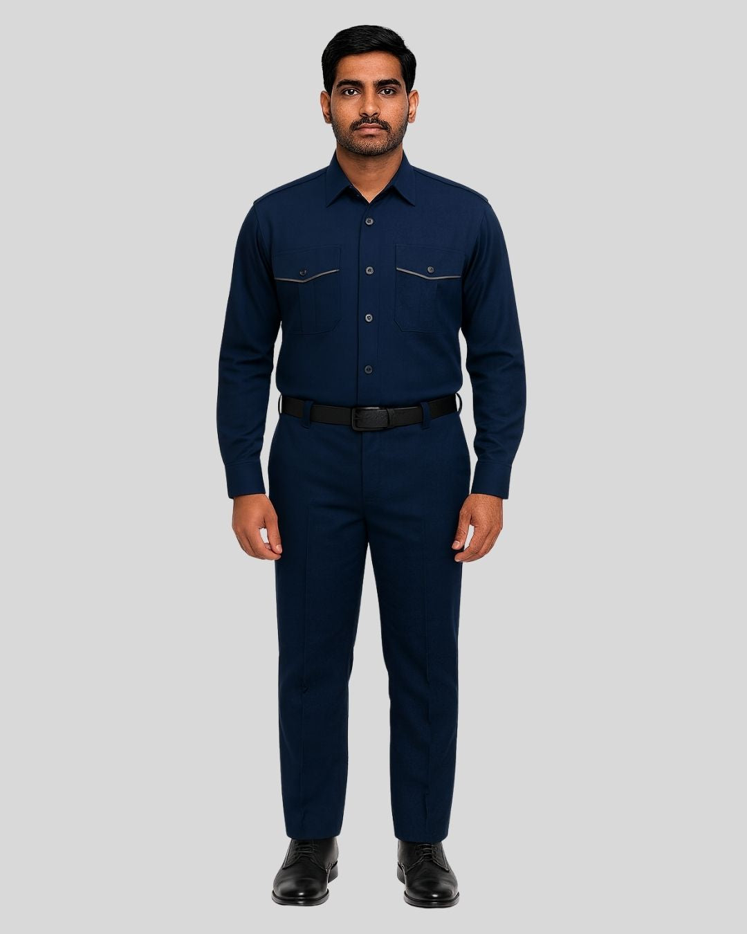 Long-sleeve shirt with a classic collar, epaulets on the shoulders, dual flap chest pockets trimmed with grey piping, and a button placket. Paired with matching trousers featuring belt loops and a coordinating belt.